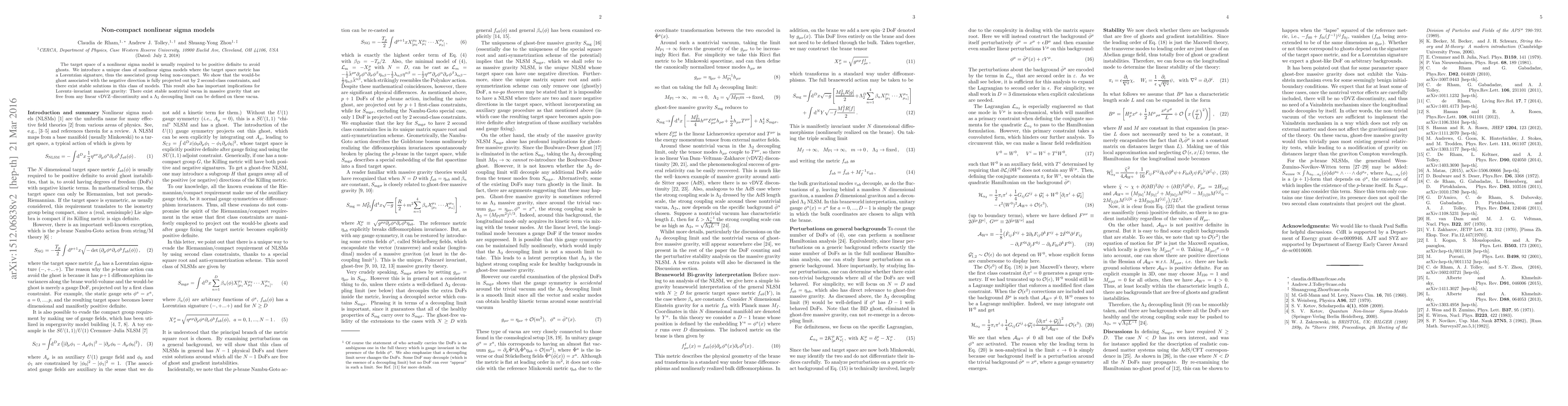 The target space of a nonlinear sigma model is usually required to be positive definite to avoid ghosts. We introduce a unique class of nonlinear sigma models where the target space metric has a Lorentzian signature, thus the associated group being non-compact. We show that the would-be ghost associated with the negative direction is fully projected out by 2 second-class constraints, and there exist stable solutions in this class of models. This result also has important implications for Lorentz--invariant massive gravity: There exist stable nontrivial vacua in massive gravity that are free from any linear vDVZ--discontinuity and a $\Lambda_2$ decoupling limit can be defined on these vacua.