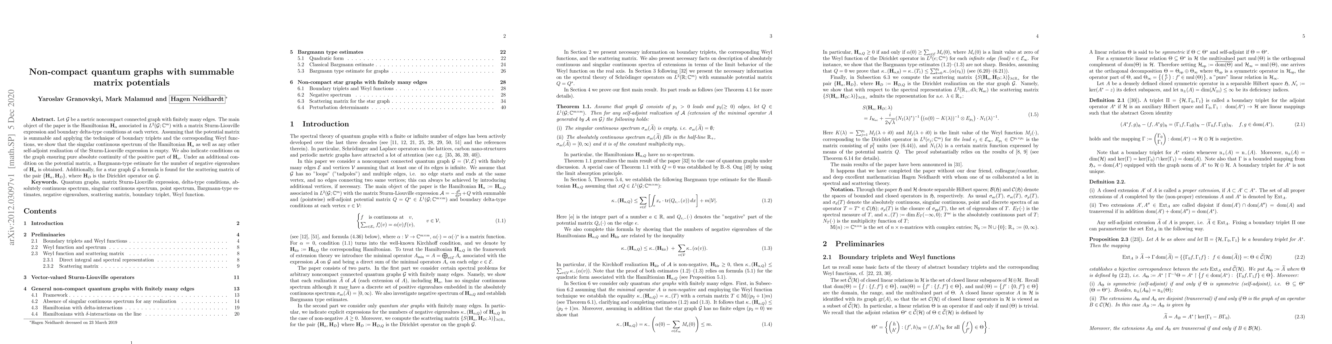 Let $\mathcal{G}$ be a metric noncompact connected graph with finitely many edges. The main object of the paper is the Hamiltonian ${\bf H}_{\alpha}$ associated in $L^2(\mathcal{G};\mathbb{C}^m)$ with a matrix Sturm-Liouville expression and boundary delta-type conditions at each vertex. Assuming that the potential matrix is summable and applying the technique of boundary triplets and the corresponding Weyl functions, we show that the singular continuous spectrum of the Hamiltonian ${\bf H}_{\alpha}$ as well as any other self-adjoint realization of the Sturm-Liouville expression is empty. We also indicate conditions on the graph ensuring pure absolute continuity of the positive part of ${\bf H}_{\alpha}$. Under an additional condition on the potential matrix, a Bargmann-type estimate for the number of negative eigenvalues of ${\bf H}_{\alpha}$ is obtained. Additionally, for a star graph $\mathcal{G}$ a formula is found for the scattering matrix of the pair $\{{\bf H}_{\alpha}, {\bf H}_D\}$, where ${\bf H}_D$ is the Dirichlet operator on $\mathcal{G}$.
