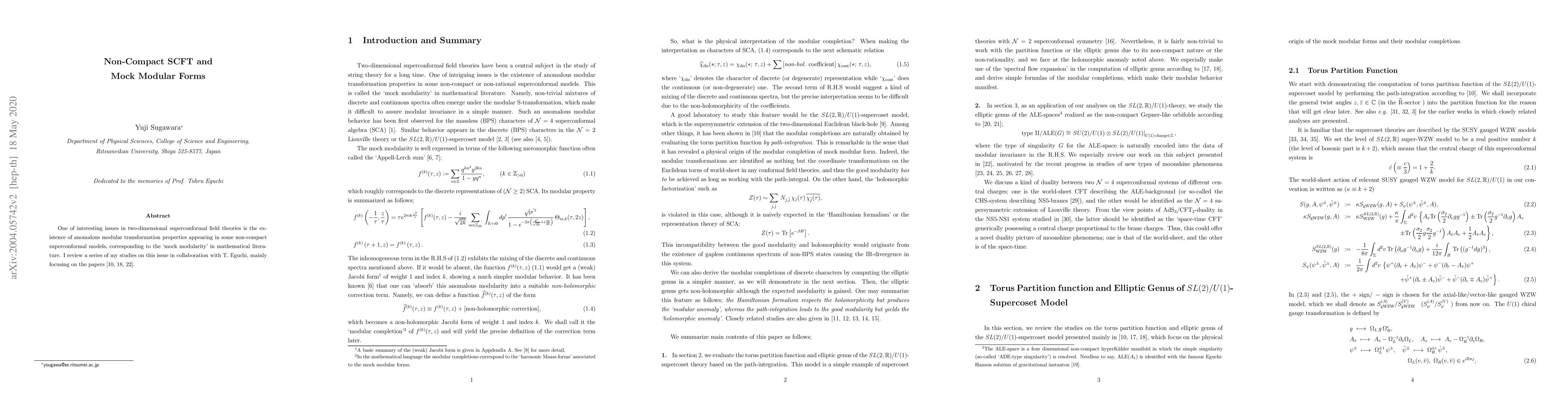 The research methodology involves a detailed analysis of non-compact superconformal field theories (SCFTs) focusing on mock modular transformation properties, specifically in collaboration with T. Eguchi. The studies are based on previous works [arXiv:1012.5721 [hep-th]], [arXiv:1407.7721 [hep-th]], and [arXiv:1603.02903 [hep-th]].