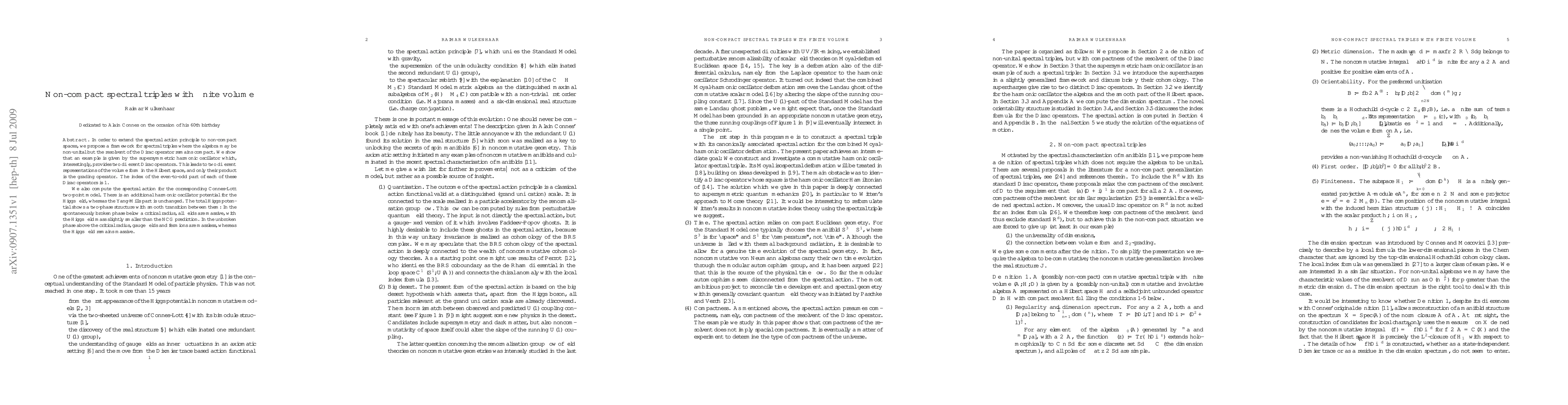 In order to extend the spectral action principle to non-compact spaces, we propose a framework for spectral triples where the algebra may be non-unital but the resolvent of the Dirac operator remains compact. We show that an example is given by the supersymmetric harmonic oscillator which, interestingly, provides two different Dirac operators. This leads to two different representations of the volume form in the Hilbert space, and only their product is the grading operator. The index of the even-to-odd part of each of these Dirac operators is 1. We also compute the spectral action for the corresponding Connes-Lott two-point model. There is an additional harmonic oscillator potential for the Higgs field, whereas the Yang-Mills part is unchanged. The total Higgs potential shows a two-phase structure with smooth transition between them: In the spontaneously broken phase below a critical radius, all fields are massive, with the Higgs field mass slightly smaller than the NCG prediction. In the unbroken phase above the critical radius, gauge fields and fermions are massless, whereas the Higgs field remains massive.