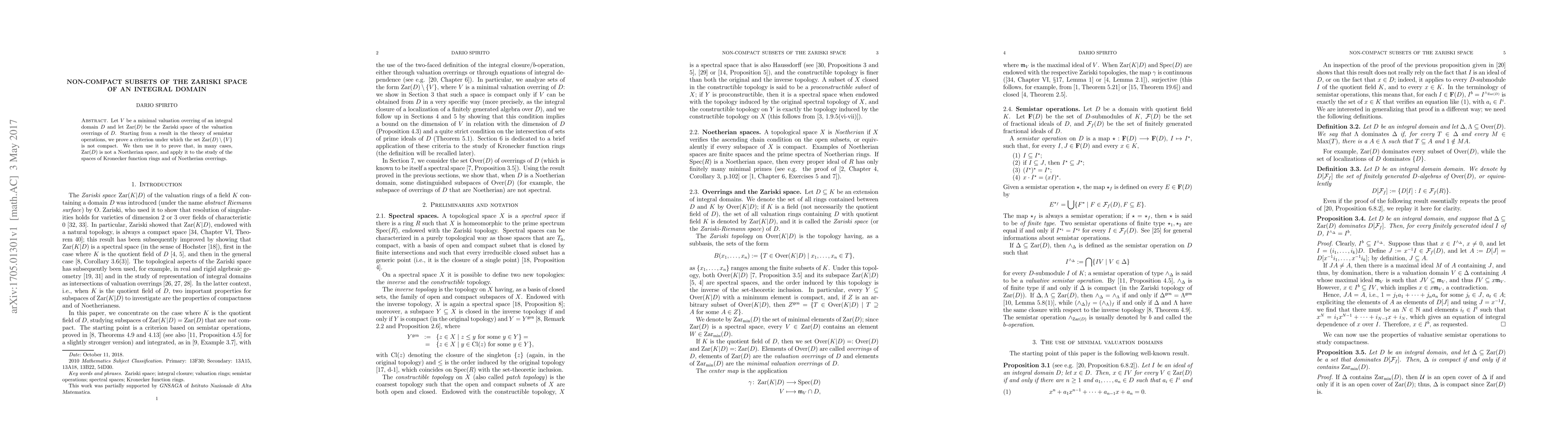 Let $V$ be a minimal valuation overring of an integral domain $D$ and let $\mathrm{Zar}(D)$ be the Zariski space of the valuation overrings of $D$. Starting from a result in the theory of semistar operations, we prove a criterion under which the set $\mathrm{Zar}(D)\setminus\{V\}$ is not compact. We then use it to prove that, in many cases, $\mathrm{Zar}(D)$ is not a Noetherian space, and apply it to the study of the spaces of Kronecker function rings and of Noetherian overrings.