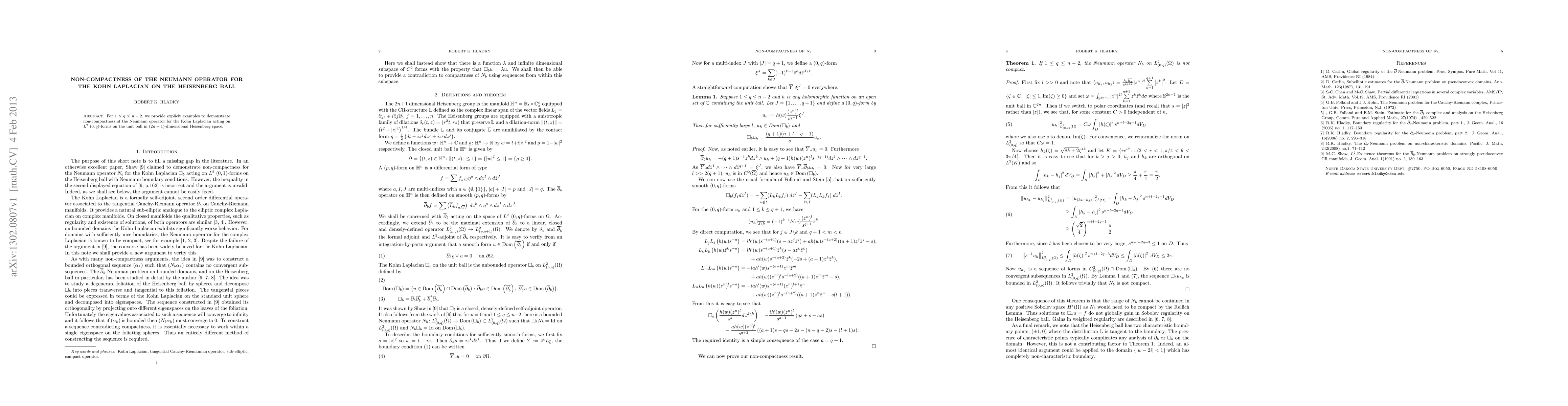 For $1\leq q \leq n-2$, we provide explicit examples to demonstrate non-compactness of the Neumann operator for the Kohn Laplacian acting on $L^2$ $(0,q)$-forms on the unit ball in $(2n+1)$-dimensional Heisenberg space.
