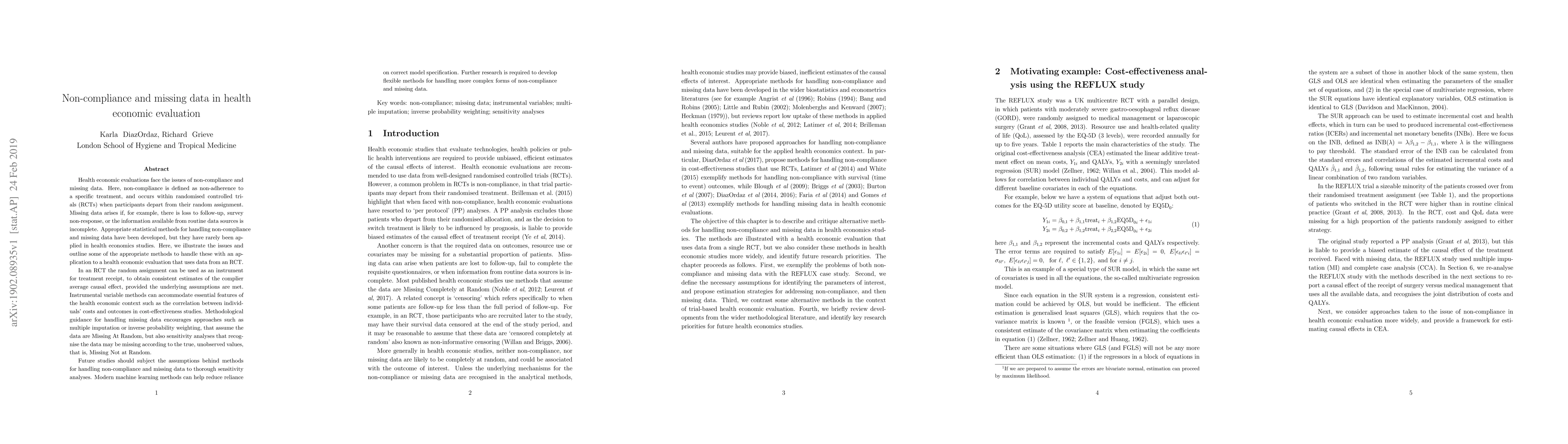 This paper discusses the challenges of non-compliance and missing data in health economic evaluations, emphasizing the need for appropriate statistical methods. It highlights instrumental variable methods for handling non-compliance and suggests multiple imputation or inverse probability weighting for missing data, advocating for thorough sensitivity analyses to test underlying assumptions.