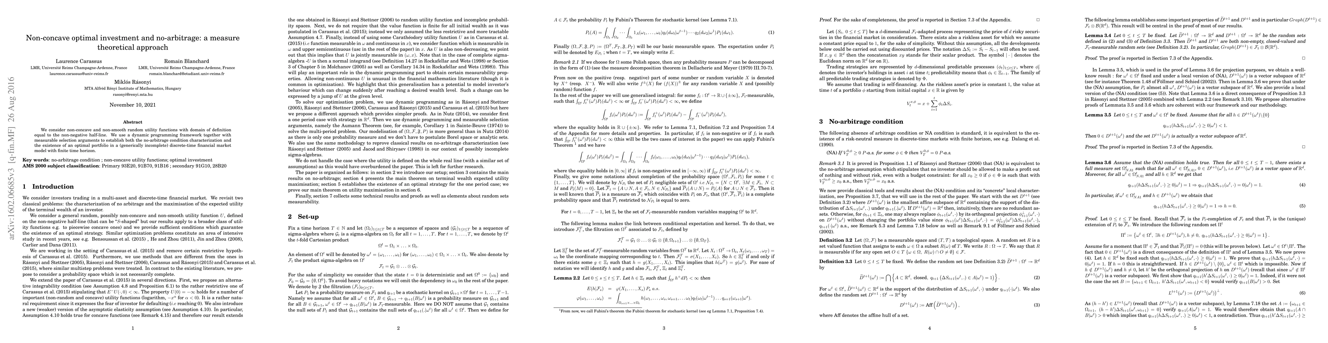 We consider non-concave and non-smooth random utility functions with do- main of definition equal to the non-negative half-line. We use a dynamic pro- gramming framework together with measurable selection arguments to establish both the no-arbitrage condition characterization and the existence of an optimal portfolio in a (generically incomplete) discrete-time financial market model with finite time horizon. In contrast to the existing literature, we propose to consider a probability space which is not necessarily complete.