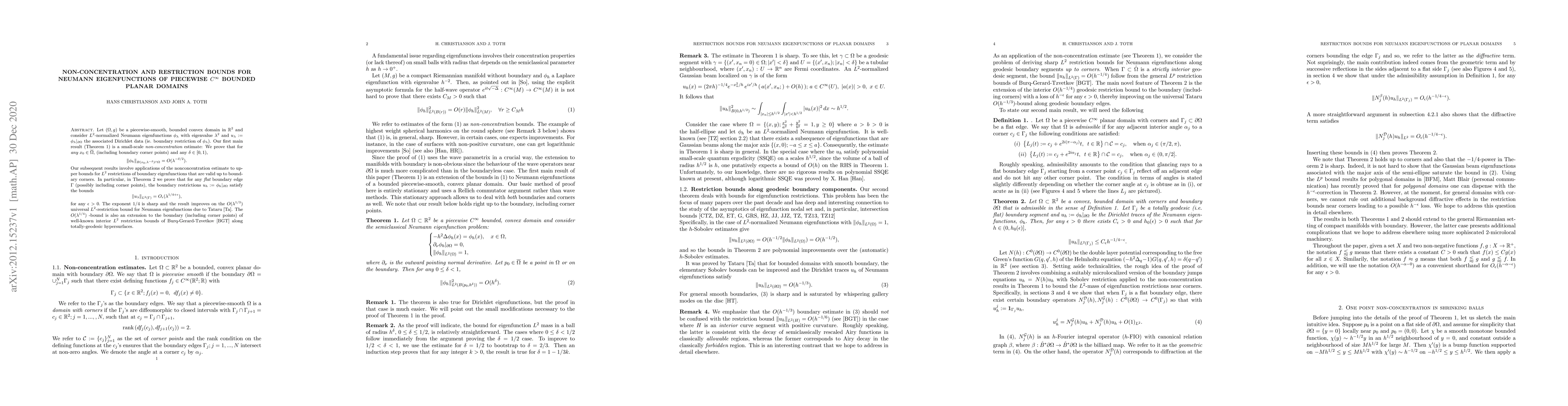 Let $(\Omega,g)$ be a piecewise-smooth, bounded convex domain in $\R^2$ and consider $L^2$-normalized Neumann eigenfunctions $\phi_{\lambda}$ with eigenvalue $\lambda^2$ and $u_{\lambda}:= \phi_{\lambda} |_{\partial \Omega}$ the associated Dirichlet data (ie. boundary restriction of $\phi_{\lambda}$). Our first main result (Theorem \ref{T:non-con}) is a small-scale {\em non-concentration} estimate: We prove that for {\em any} $x_0 \in \overline{\Omega},$ (including boundary corner points) and any $\delta \in [0,1),$ $$ \| \phi_h \|_{B(x_0,\lambda^{-\delta})\cap \Omega} = O(\lambda^{-\delta/2}).$$ Our subsequent results involve applications of the nonconcentration estimate to upper bounds for $L^2$ restrictions of boundary eigenfunctions that are valid up to boundary corners. In particular, in Theorem \ref{dirichlet} we prove that for any {\em flat} boundary edge $\Gamma$ (possibly including corner points), the boundary restrictions $u_h:= \phi_h |_{\partial \Omega}$ satisfy the bounds $$ \|u_{\lambda} \|_{L^2(\Gamma)} = O_{\epsilon}(\lambda^{1/4 + \epsilon}),$$ for any $\epsilon >0.$ The exponent $1/4$ is sharp and the result improves on the $O(\lambda^{1/3})$ universal $L^2$-restriction bound for Neumann eigenfunctions due to Tataru \cite{Ta}. The $O(\lambda^{1/4})$ -bound is also an extension to the boundary (including corner points) of well-known interior $L^2$ restriction bounds of Burq-Gerard-Tzvetkov \cite{BGT} along totally-geodesic hypersurfaces.