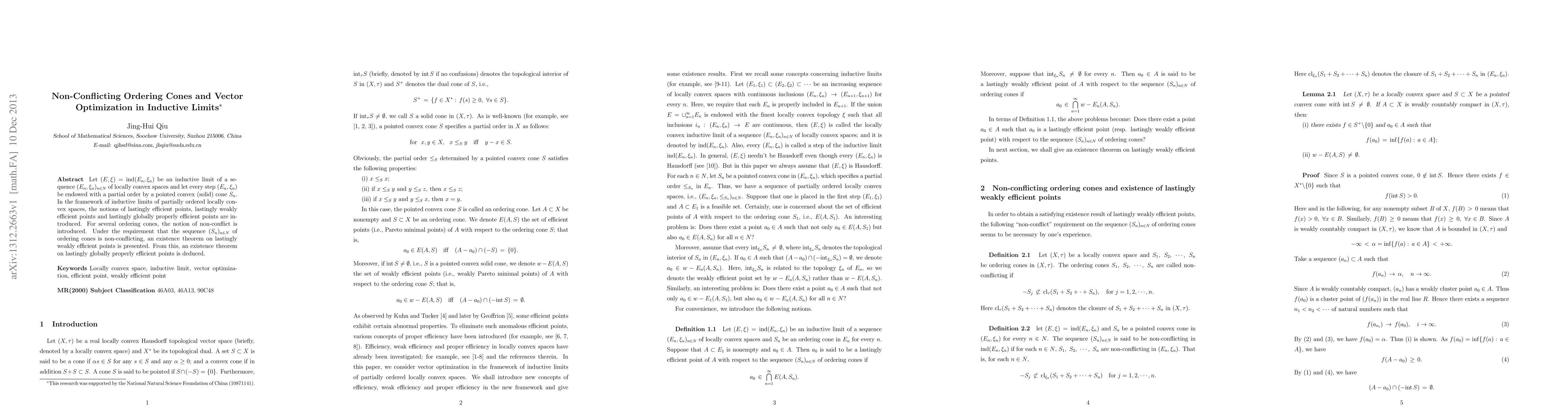 Let $(E,\xi)={\rm ind}(E_n, \xi_n)$ be an inductive limit of a sequence $(E_n, \xi_n)_{n\in N}$ of locally convex spaces and let every step $(E_n, \xi_n)$ be endowed with a partial order by a pointed convex (solid) cone $S_n$. In the framework of inductive limits of partially ordered locally convex spaces, the notions of lastingly efficient points, lastingly weakly efficient points and lastingly globally properly efficient points are introduced. For several ordering cones, the notion of non-conflict is introduced. Under the requirement that the sequence $(S_n)_{n\in N}$ of ordering cones is non-conflicting, an existence theorem on lastingly weakly efficient points is presented. From this, an existence theorem on lastingly globally properly efficient points is deduced.