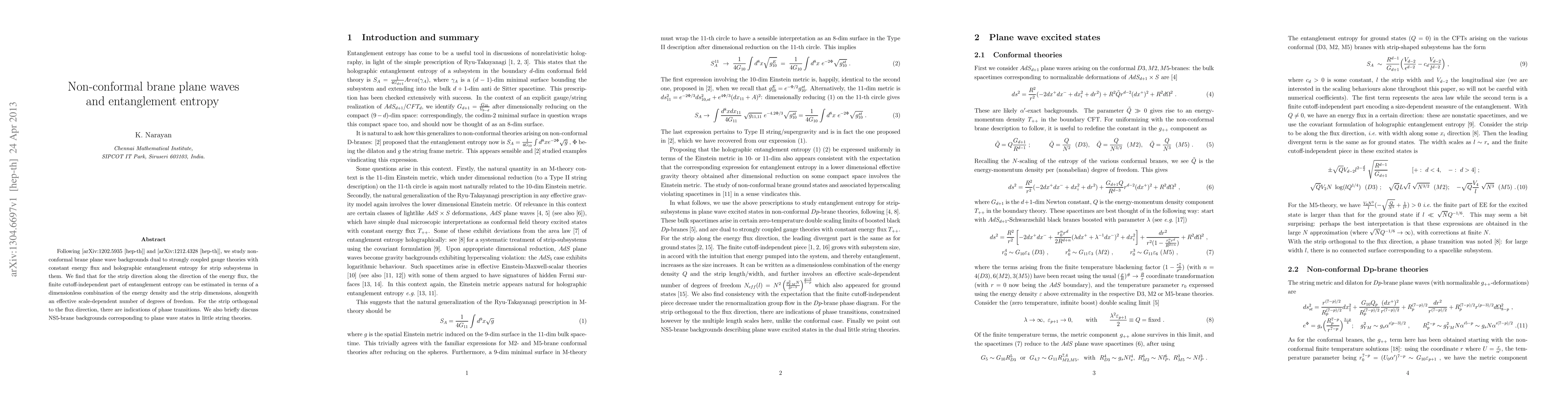 This paper investigates non-conformal brane plane wave backgrounds in strongly coupled gauge theories, finding that entanglement entropy along the energy flux direction correlates with energy density and strip dimensions, while orthogonal strips show signs of phase transitions. The study also touches on NS5-brane backgrounds in little string theories.