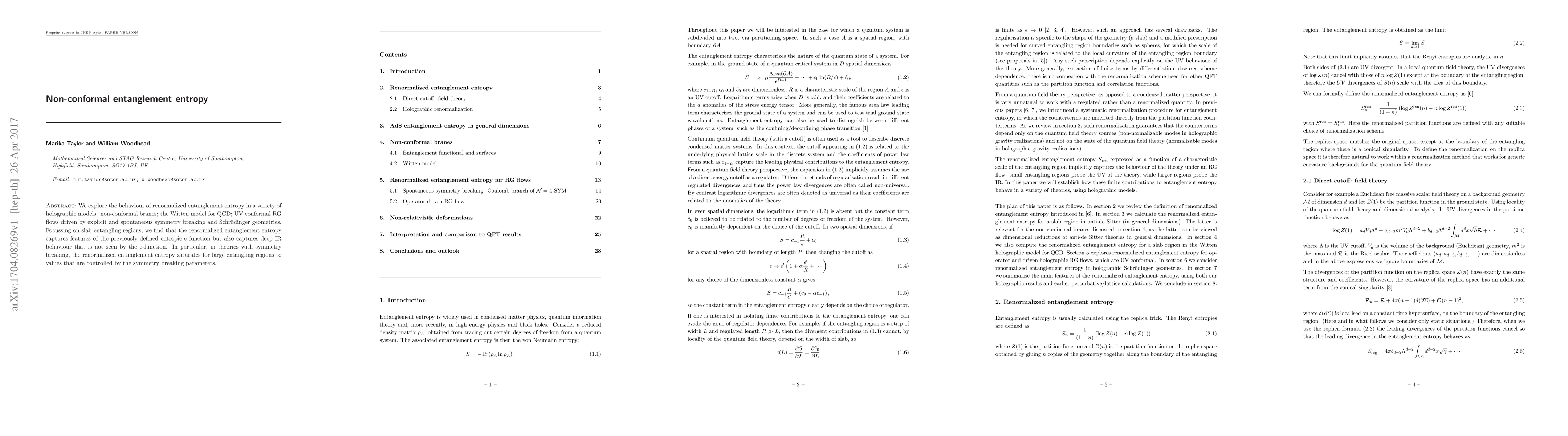 This paper investigates renormalized entanglement entropy in non-conformal holographic models, revealing that it captures IR behavior not visible through the entropic c-function and saturates to values dictated by symmetry breaking parameters in such theories.