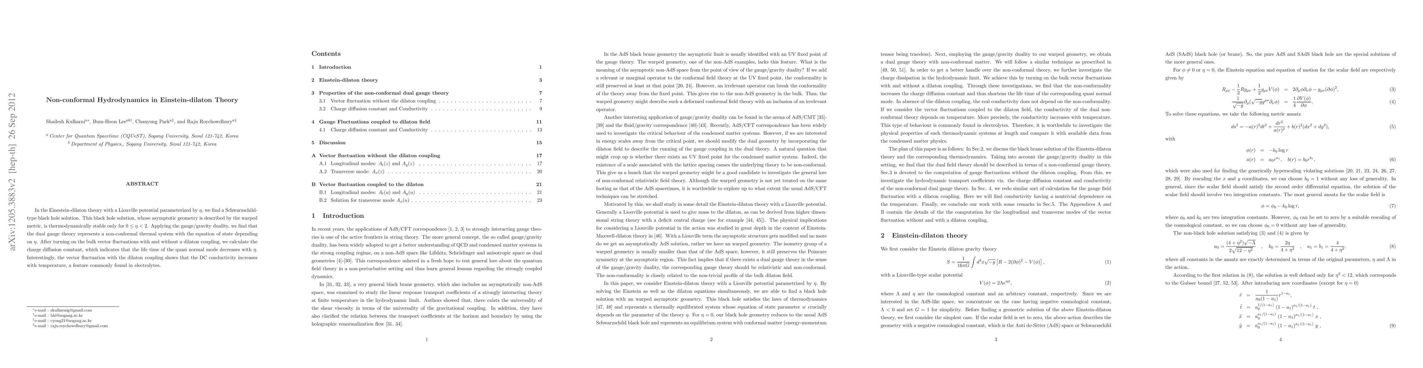 In the Einestein-dilaton theory with a Liouville potential parameterized by $\eta$, we find a Schwarzschild-type black hole solution. This black hole solution, whose asymptotic geometry is described by the warped metric, is thermodynamically stable only for $0 \le \eta < 2$. Applying the gauge/gravity duality, we find that the dual gauge theory represents a non-conformal thermal system with the equation of state depending on $\eta$. After turning on the bulk vector fluctuations with and without a dilaton coupling, we calculate the charge diffusion constant, which indicates that the life time of the quasi normal mode decreases with $\eta$. Interestingly, the vector fluctuation with the dilaton coupling shows that the DC conductivity increases with temperature, a feature commonly found in electrolytes.
