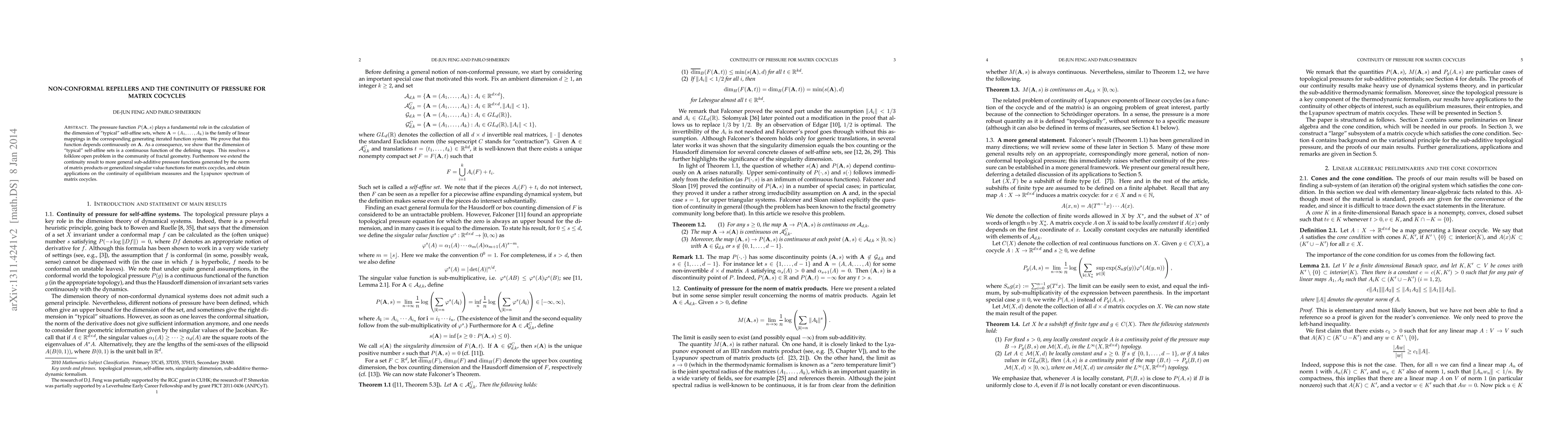 This paper proves the continuity of the pressure function $P(A, s)$ with respect to the linear mappings $A$, resolving a long-standing open problem in fractal geometry. It extends this result to sub-additive pressure functions for matrix cocycles, with implications for the continuity of equilibrium measures and the Lyapunov spectrum.