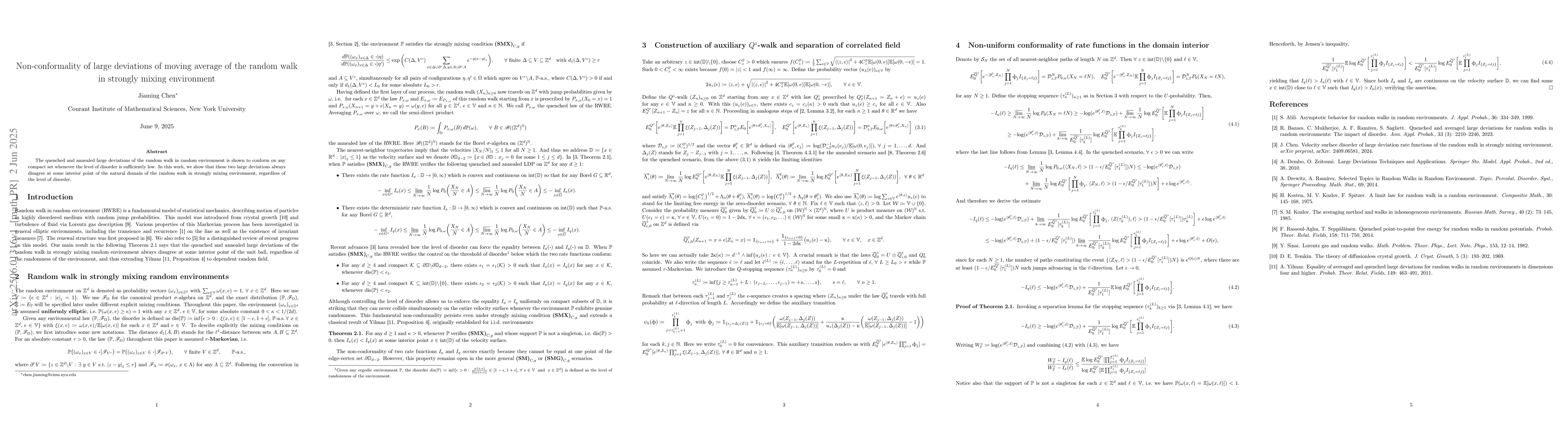 This research demonstrates that in a strongly mixing random environment, the large deviations of a moving average random walk do not conform for any level of disorder, contradicting previous beliefs that they would agree under low disorder conditions.