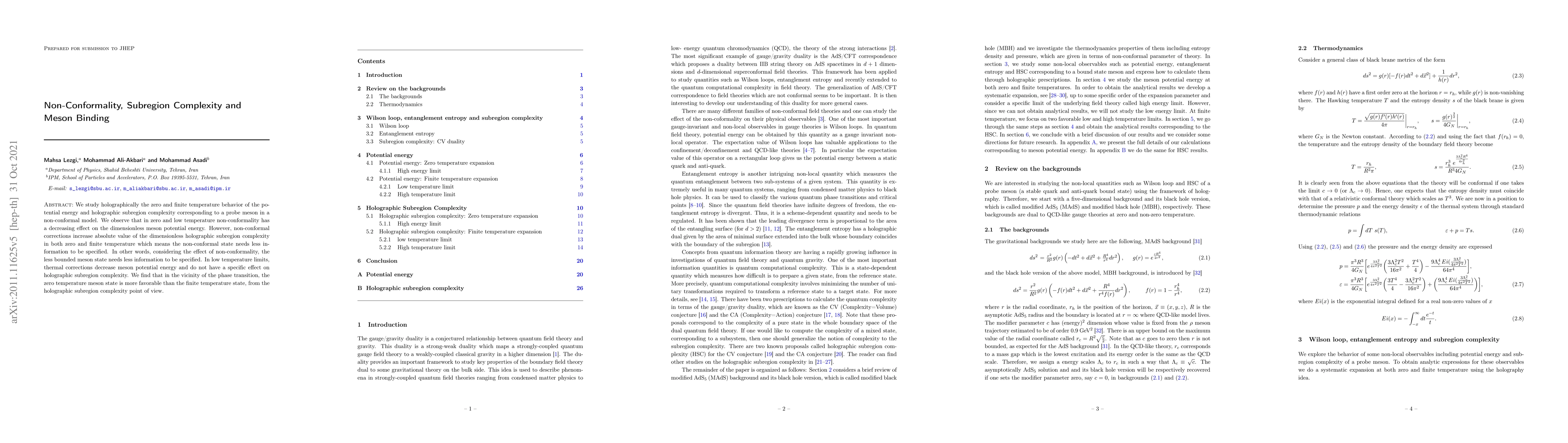 This paper investigates the impact of non-conformality on meson potential energy and holographic subregion complexity at zero and finite temperatures. Non-conformality decreases meson potential energy but increases holographic subregion complexity, indicating less information is needed to specify less bounded meson states.