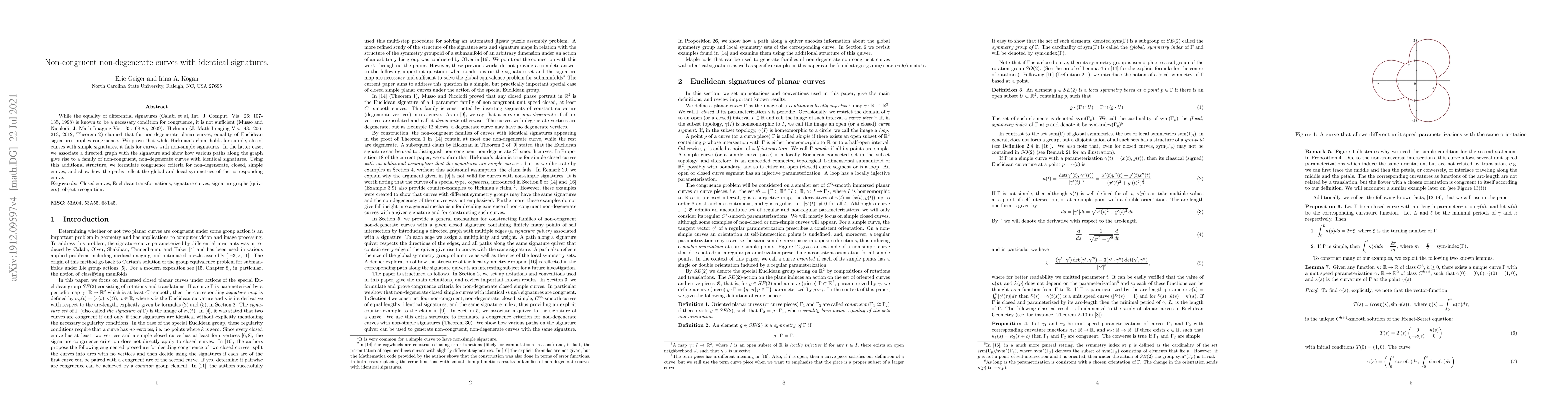 Researchers found that equality of signatures is not sufficient to guarantee congruence for non-degenerate curves with non-simple signatures. They showed a family of non-congruent, non-degenerate curves with identical signatures by analyzing directed graphs associated with their signatures.