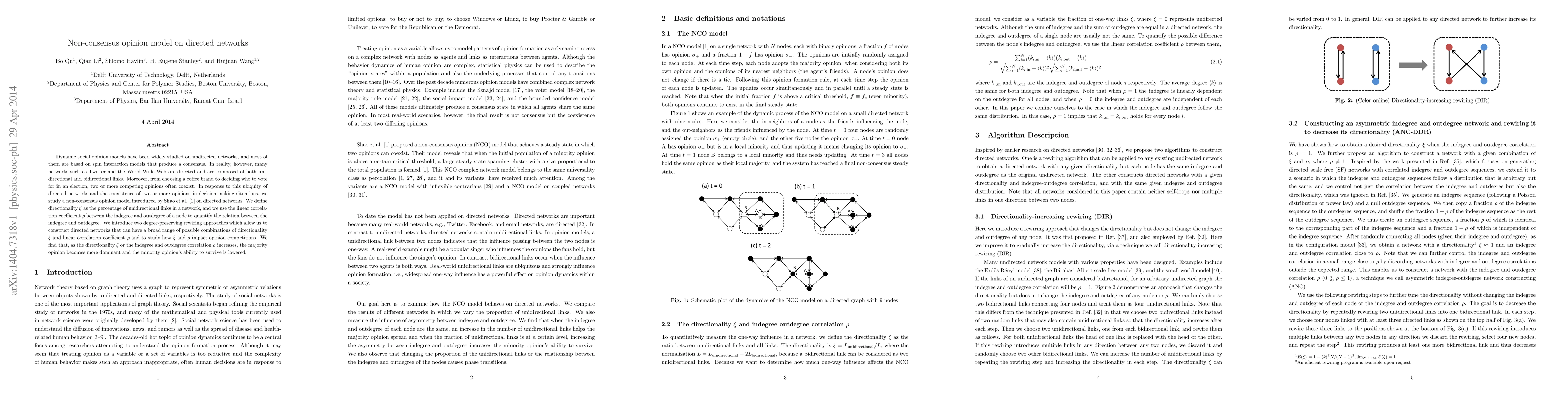 This paper explores a non-consensus opinion model on directed networks, addressing the coexistence of competing opinions in directed social networks like Twitter. It introduces rewiring approaches to study the impact of directionality and correlation between indegree and outdegree on opinion dynamics, finding that higher directionality and correlation diminish minority opinions.