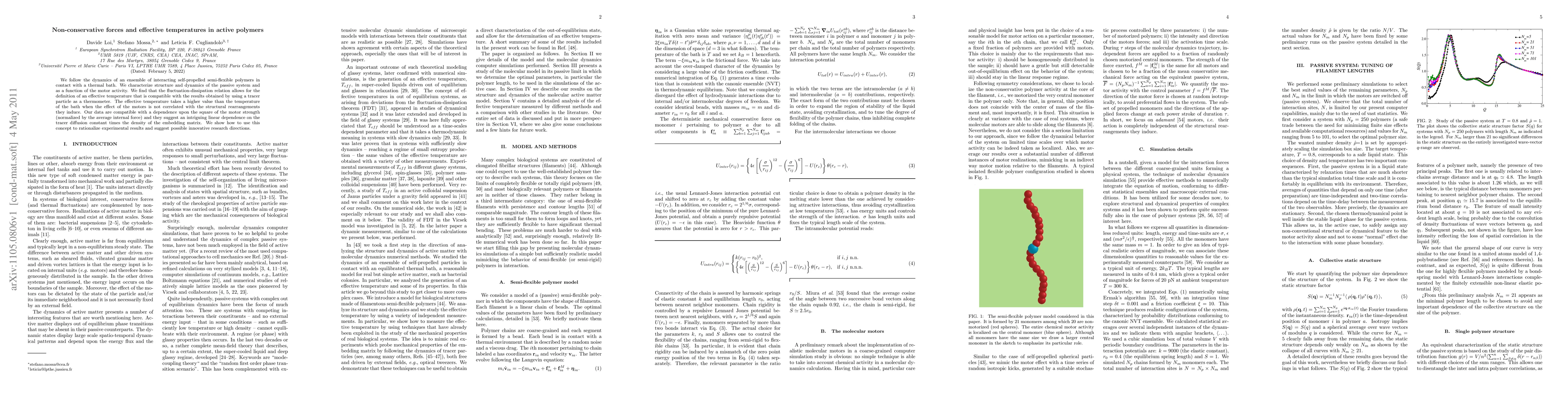 We follow the dynamics of an ensemble of interacting self-propelled semi-flexible polymers in contact with a thermal bath. We characterize structure and dynamics of the passive system and as a function of the motor activity. We find that the fluctuation-dissipation relation allows for the definition of an effective temperature that is compatible with the results obtained by using a tracer particle as a thermometer. The effective temperature takes a higher value than the temperature of the bath when the effect of the motors is not correlated with the structural rearrangements they induce. Our data are compatible with a dependence upon the square of the motor strength (normalized by the average internal force) and they suggest an intriguing linear dependence on the tracer diffusion constant times the density of the embedding matrix. We show how to use this concept to rationalize experimental results and suggest possible innovative research directions.