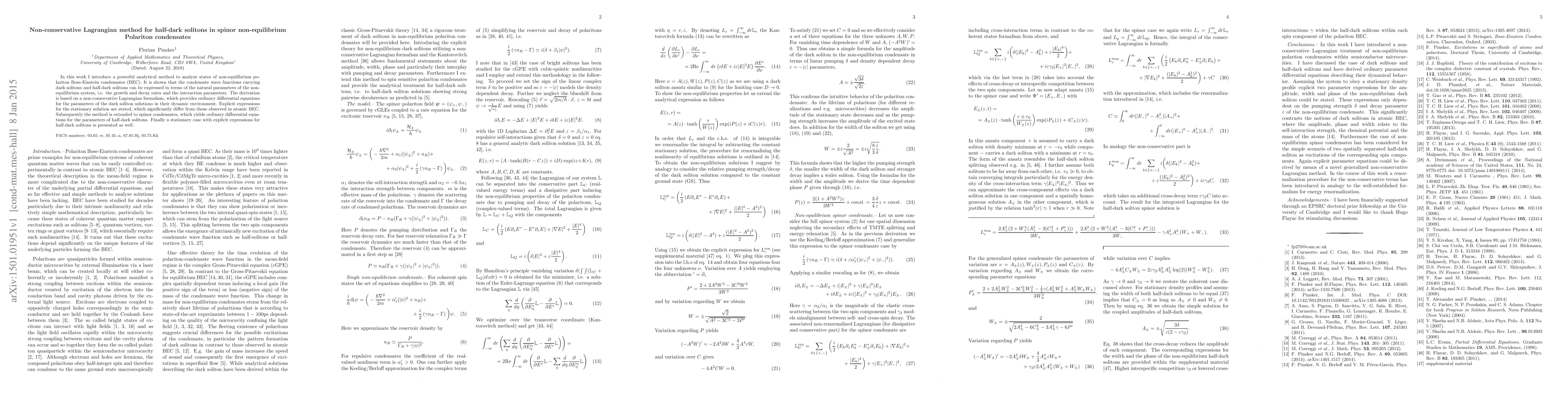 This paper introduces a non-conservative Lagrangian method for analyzing non-equilibrium polariton Bose-Einstein condensates, particularly focusing on dark and half-dark solitons. The method provides ordinary differential equations for soliton parameters, yielding stationary solutions that differ from those in atomic BECs, and extends to spinor condensates.