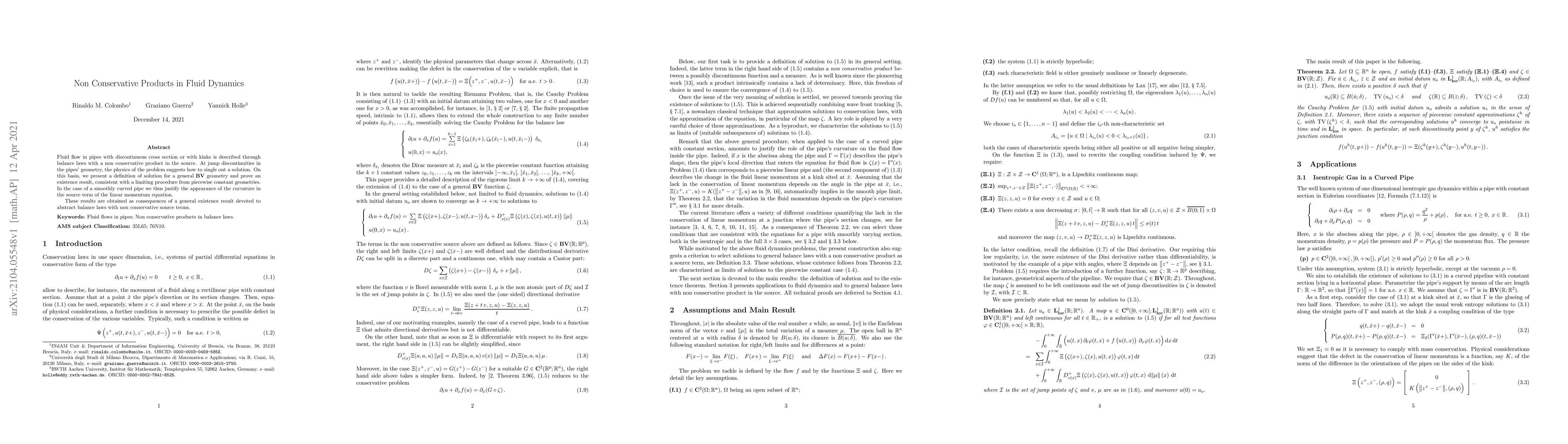 Fluid flow in pipes with discontinuous cross section or with kinks is described through balance laws with a non conservative product in the source. At jump discontinuities in the pipes' geometry, the physics of the problem suggests how to single out a solution. On this basis, we present a definition of solution for a general BV geometry and prove an existence result, consistent with a limiting procedure from piecewise constant geometries. In the case of a smoothly curved pipe we thus justify the appearance of the curvature in the source term of the linear momentum equation. These results are obtained as consequences of a general existence result devoted to abstract balance laws with non conservative source terms.