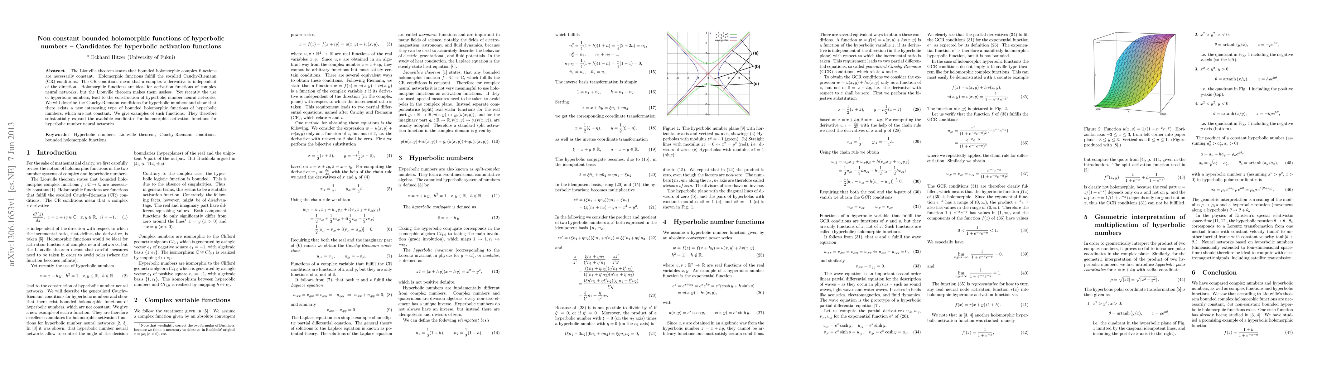 The Liouville theorem states that bounded holomorphic complex functions are necessarily constant. Holomorphic functions fulfill the socalled Cauchy-Riemann (CR) conditions. The CR conditions mean that a complex $z$-derivative is independent of the direction. Holomorphic functions are ideal for activation functions of complex neural networks, but the Liouville theorem makes them useless. Yet recently the use of hyperbolic numbers, lead to the construction of hyperbolic number neural networks. We will describe the Cauchy-Riemann conditions for hyperbolic numbers and show that there exists a new interesting type of bounded holomorphic functions of hyperbolic numbers, which are not constant. We give examples of such functions. They therefore substantially expand the available candidates for holomorphic activation functions for hyperbolic number neural networks. Keywords: Hyperbolic numbers, Liouville theorem, Cauchy-Riemann conditions, bounded holomorphic functions