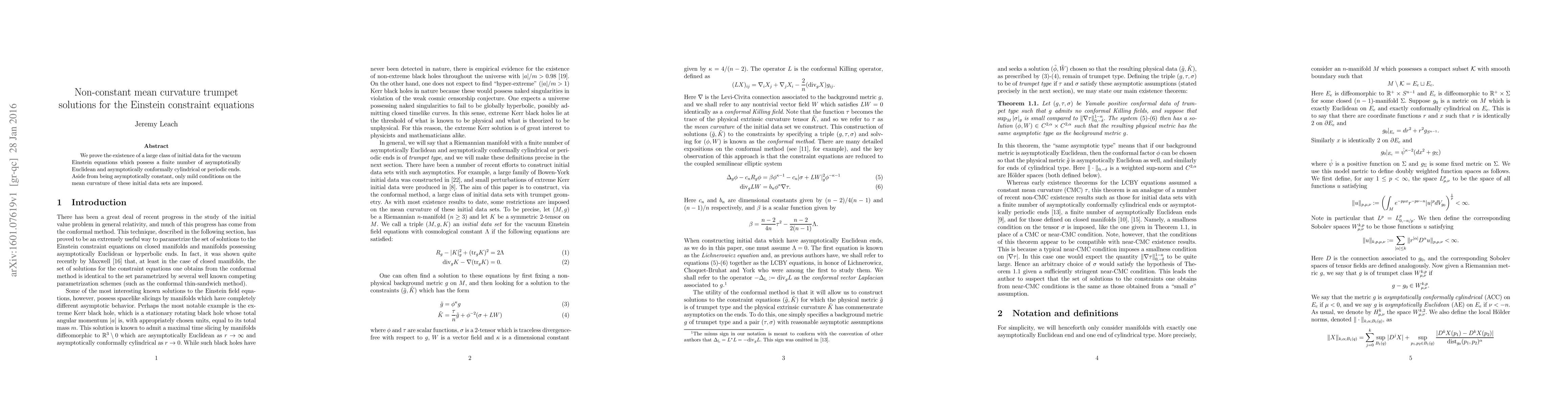 Summary: The paper proves the existence of a wide range of initial data solutions for the vacuum Einstein equations with finite, asymptotically Euclidean or conformally cylindrical ends, under mild mean curvature conditions. These solutions provide new insights into the structure of spacetime in cosmological models.