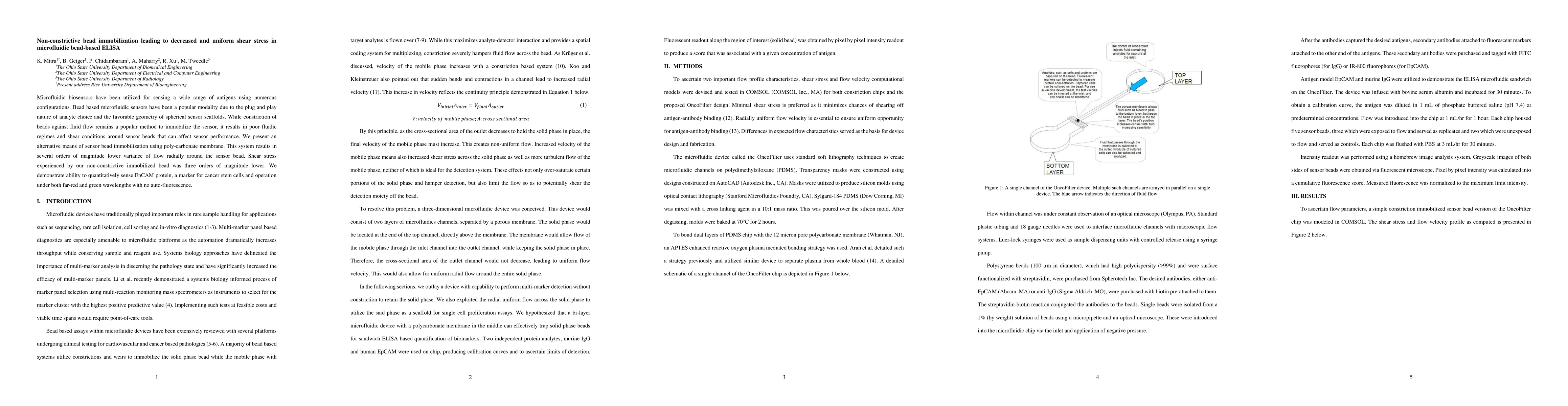 Microfluidic biosensors have been utilized for sensing a wide range of antigens using numerous configurations. Bead based microfluidic sensors have been a popular modality due to the plug and play nature of analyte choice and the favorable geometry of spherical sensor scaffolds. While constriction of beads against fluid flow remains a popular method to immobilize the sensor, it results in poor fluidic regimes and shear conditions around sensor beads that can affect sensor performance. We present an alternative means of sensor bead immobilization using poly-carbonate membrane. This system results in several orders of magnitude lower variance of flow radially around the sensor bead. Shear stress experienced by our non-constrictive immobilized bead was three orders of magnitude lower. We demonstrate ability to quantitatively sense EpCAM protein, a marker for cancer stem cells and operation under both far-red and green wavelengths with no auto-fluorescence.