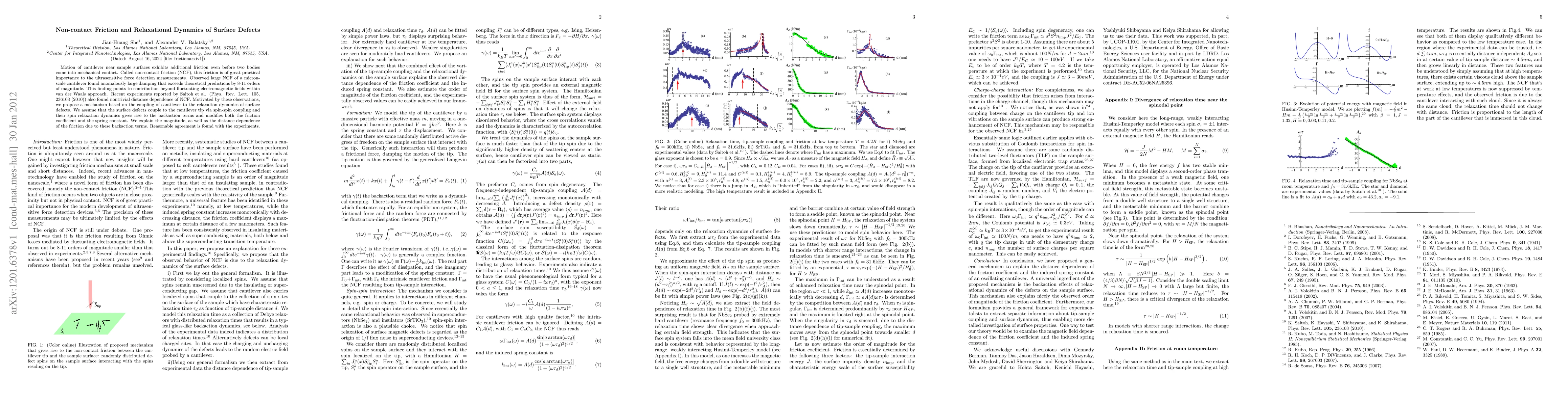 This paper explores the phenomenon of non-contact friction (NCF) observed in cantilever motion near surfaces, revealing anomalous damping that exceeds theoretical predictions. The authors propose a mechanism where surface defects' relaxation dynamics, coupled via spin-spin interactions, influence the friction and damping, providing a satisfactory explanation for the observed effects.