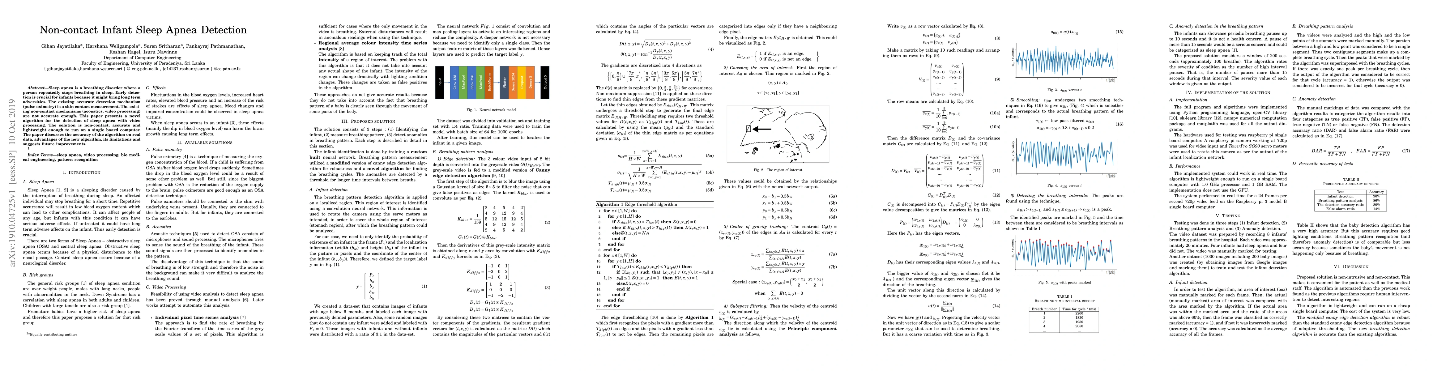 This paper proposes a novel non-contact video processing algorithm for detecting sleep apnea in infants, offering improved accuracy over existing methods and running efficiently on a single board computer. The study evaluates the algorithm's effectiveness and discusses its advantages, limitations, and potential enhancements.