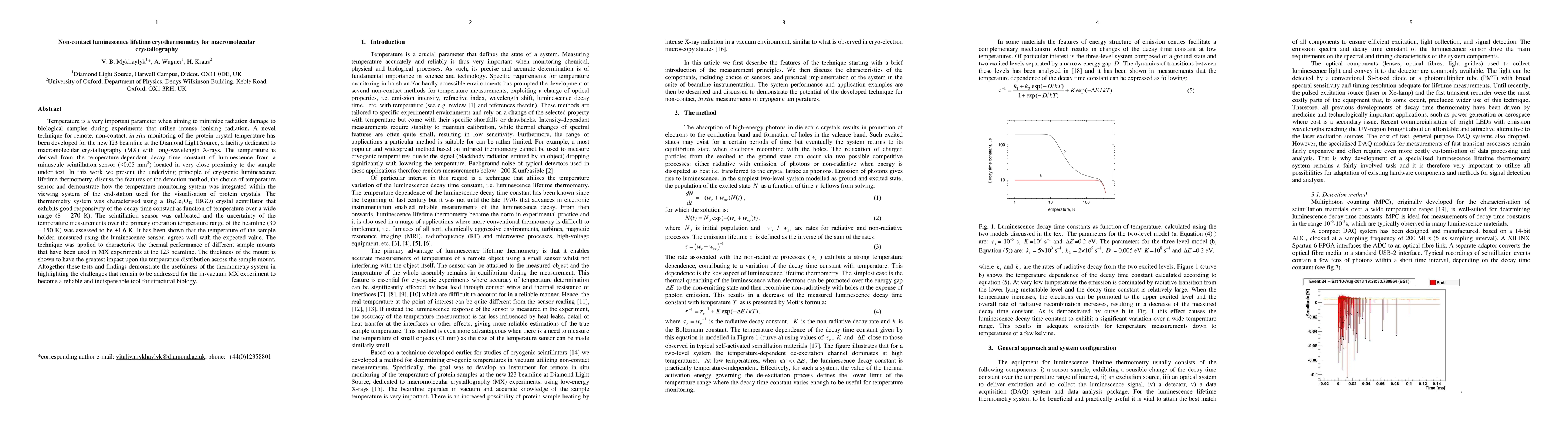 A novel technique for remote, non-contact, in situ monitoring of the protein crystal temperature has been developed for the new I23 beamline at the Diamond Light Source, a facility dedicated to macromolecular crystallography (MX) with long-wavelength X-rays. The temperature is derived from the temperature-dependant decay time constant of luminescence from a minuscule scintillation sensor (0.05 mm3) located in very close proximity to the sample under test. In this work we present the underlying principle of cryogenic luminescence lifetime thermometry, discuss the features of the detection method, the choice of temperature sensor and demonstrate how the temperature monitoring system was integrated within the viewing system of the end-station used for the visualisation of protein crystals. The thermometry system was characterised using a Bi4Ge3O12 (BGO) crystal scintillator that exhibits good responsivity of the decay time constant as function of temperature over a wide range (8-270 K). The scintillation sensor was calibrated and the uncertainty of the temperature measurements over the primary operation temperature range of the beamline (30-150 K) was assessed to be +-1.6 K. It has been shown that the temperature of the sample holder, measured using the luminescence sensor, agrees well with the expected value. The technique was applied to characterise the thermal performance of different sample mounts that have been used in MX experiments at the I23 beamline. The thickness of the mount is shown to have the greatest impact upon the temperature distribution across the sample mount. Altogether these tests and findings demonstrate the usefulness of the thermometry system in highlighting the challenges that remain to be addressed for the in-vacuum MX experiment to become a reliable and indispensable tool for structural biology