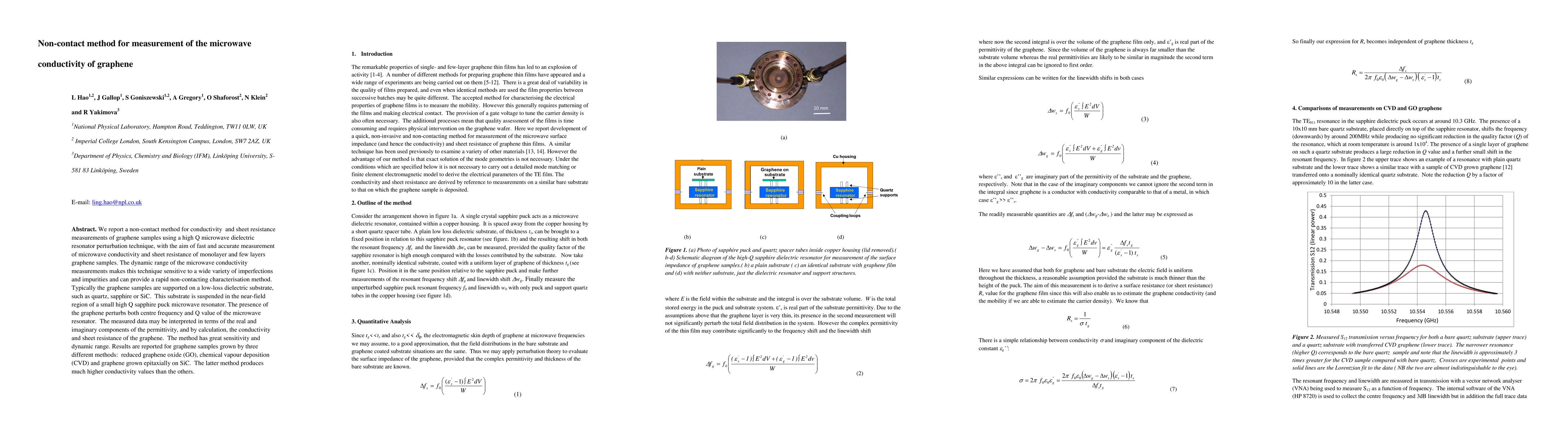 This paper presents a non-contact microwave dielectric resonator technique for measuring the conductivity and sheet resistance of graphene samples, demonstrating high sensitivity and dynamic range. The method, which uses resonator perturbation, is effective for characterizing monolayer and few-layer graphene grown by various methods, including reduced graphene oxide, CVD, and epitaxially on SiC.