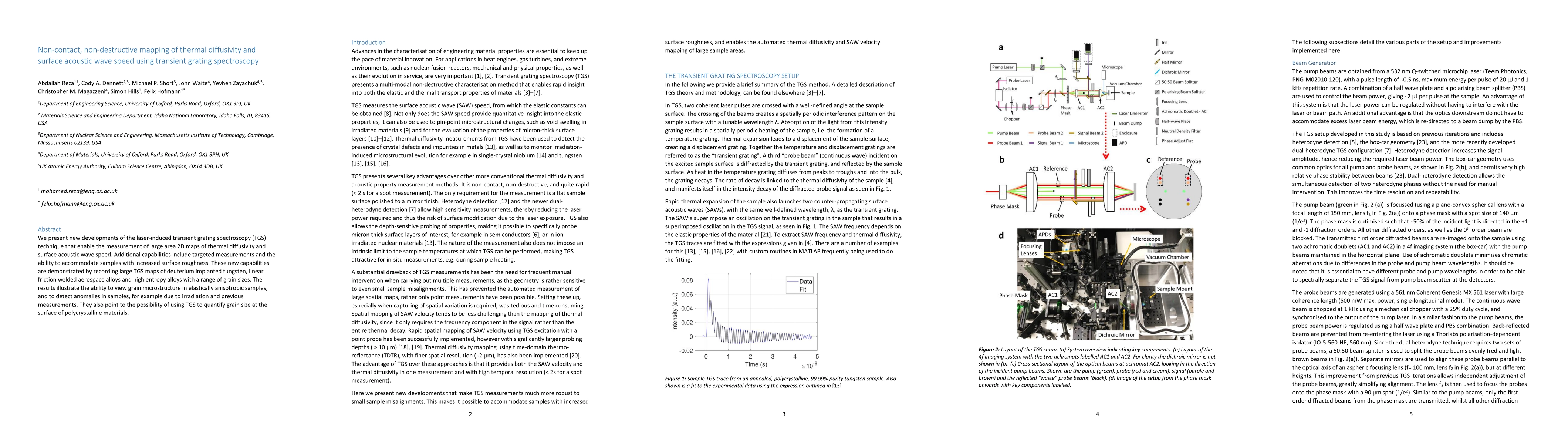 This paper introduces advanced laser-induced transient grating spectroscopy (TGS) for non-contact, non-destructive mapping of thermal diffusivity and surface acoustic wave speed over large areas, demonstrating its application on deuterium implanted tungsten, aerospace alloys, and high entropy alloys. The technique reveals grain microstructure and detects anomalies, suggesting its potential for quantifying grain size in polycrystalline materials.