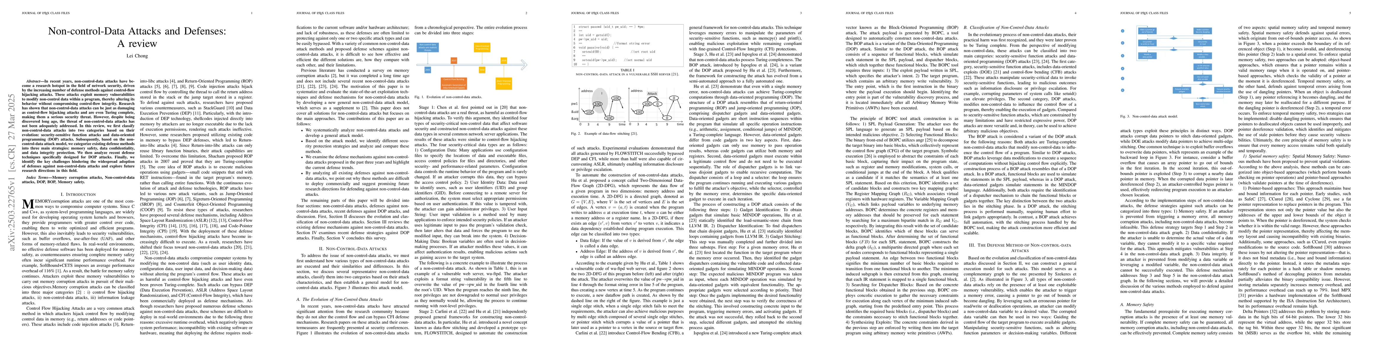 This paper reviews non-control-data attacks and their defenses, classifying attacks into security-sensitive function attacks and data-oriented programming (DOP) attacks, and categorizing defense methods into memory safety, data confidentiality, and data integrity protection strategies.