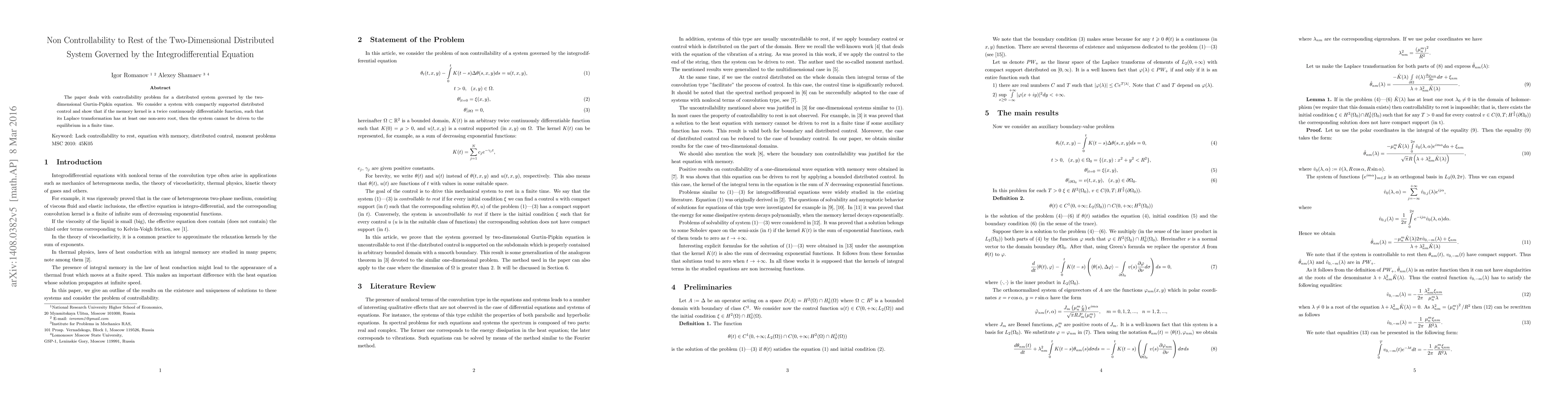 This paper investigates the controllability of a two-dimensional distributed system described by the Gurtin-Pipkin equation, revealing that if the memory kernel's Laplace transformation has a non-zero root, the system cannot be driven to rest in finite time.