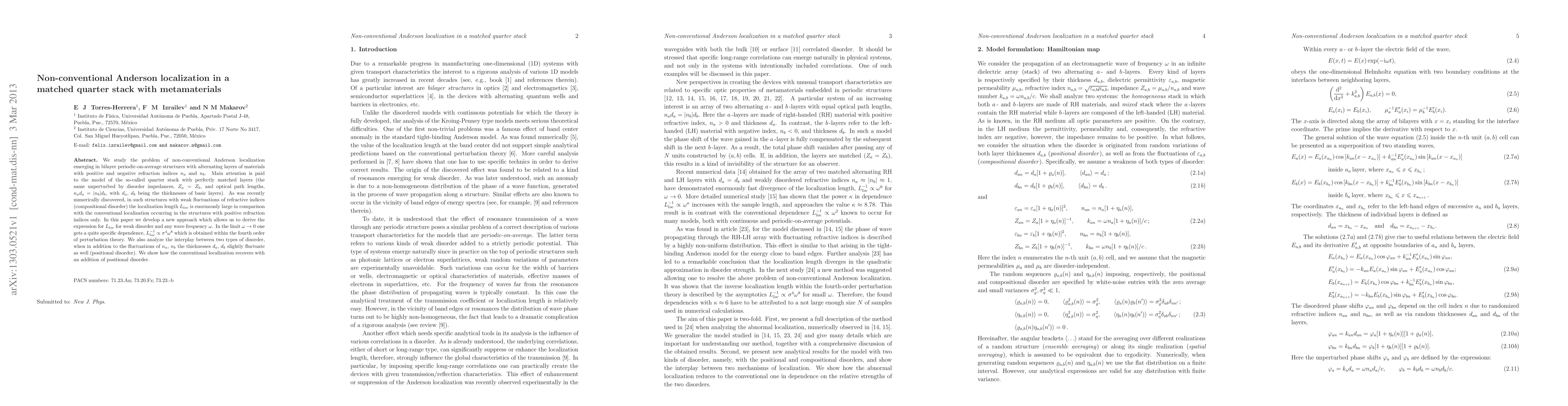 This paper investigates non-conventional Anderson localization in bilayer periodic-on-average structures with alternating layers of materials having positive and negative refraction indices. It develops a new approach to derive the localization length for weak disorder and any frequency, revealing a unique dependence in the low-frequency limit.