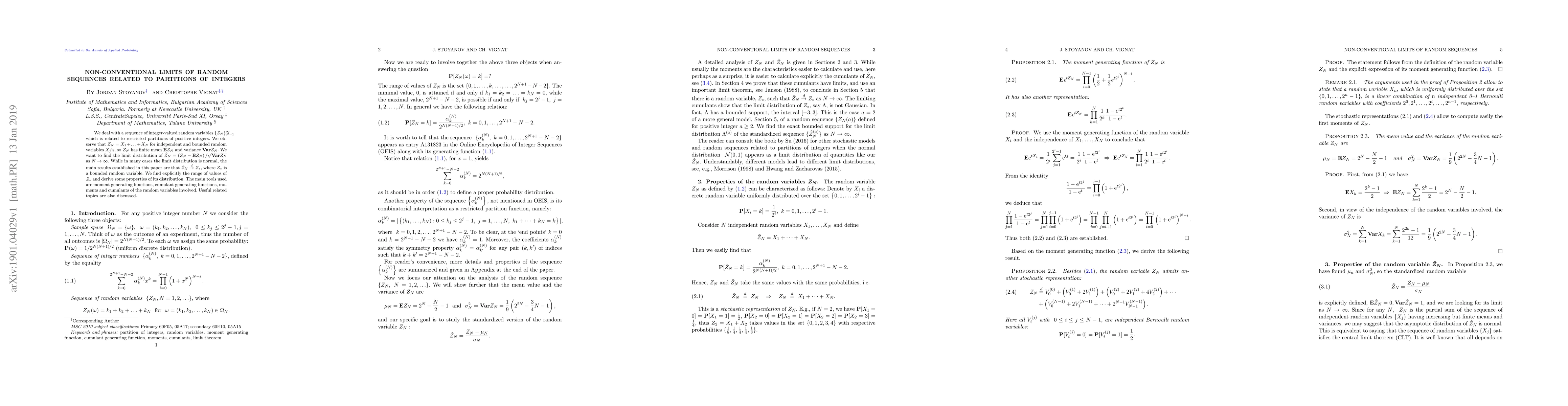 We deal with a sequence of integer-valued random variables $\{Z_N\}_{N=1}^{\infty}$ which is related to restricted partitions of positive integers. We observe that $Z_N=X_1+ \ldots + X_N$ for independent and bounded random variables $X_j$'s, so $Z_N$ has finite mean ${\bf E}Z_N$ and variance ${\bf Var}Z_N$. We want to find the limit distribution of ${\hat Z}_N=\left(Z_N-{\bf E}Z_N\right)/{\sqrt{{\bf Var}Z_N}}$ as $N \to \infty.$ While in many cases the limit distribution is normal, the main results established in this paper are that ${\hat Z}_N \overset{d}{\to} Z_{*},$ where $Z_{*}$ is a bounded random variable. We find explicitly the range of values of $Z_*$ and derive some properties of its distribution. The main tools used are moment generating functions, cumulant generating functions, moments and cumulants of the random variables involved. Useful related topics are also discussed.