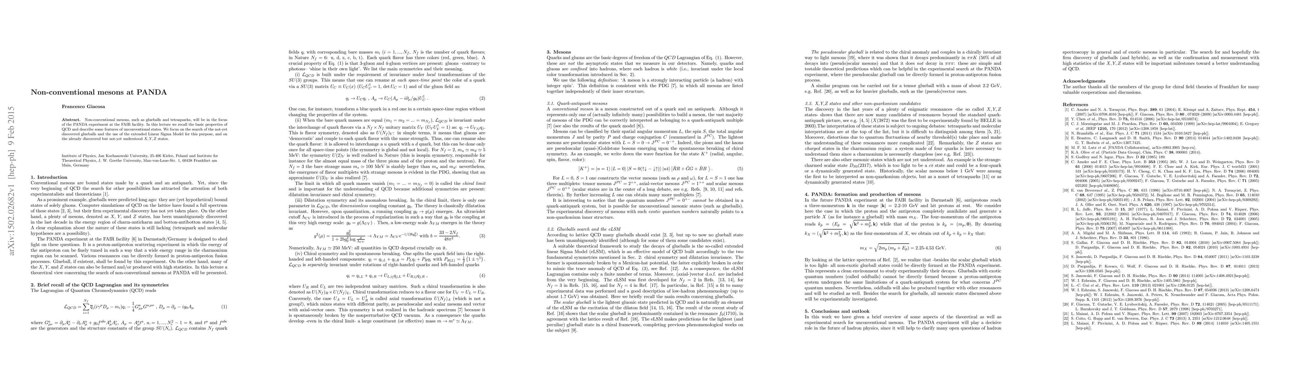 Non-conventional mesons, such as glueballs and tetraquarks, will be in the focus of the PANDA experiment at the FAIR facility. In this lecture we recall the basic properties of QCD and describe some features of unconventional states.\ We focus on the search of the not-yet discovered glueballs and the use of the extended Linear Sigma Model for this purpose, and on the already discovered but not-yet understood $X,Y,Z$ states.
