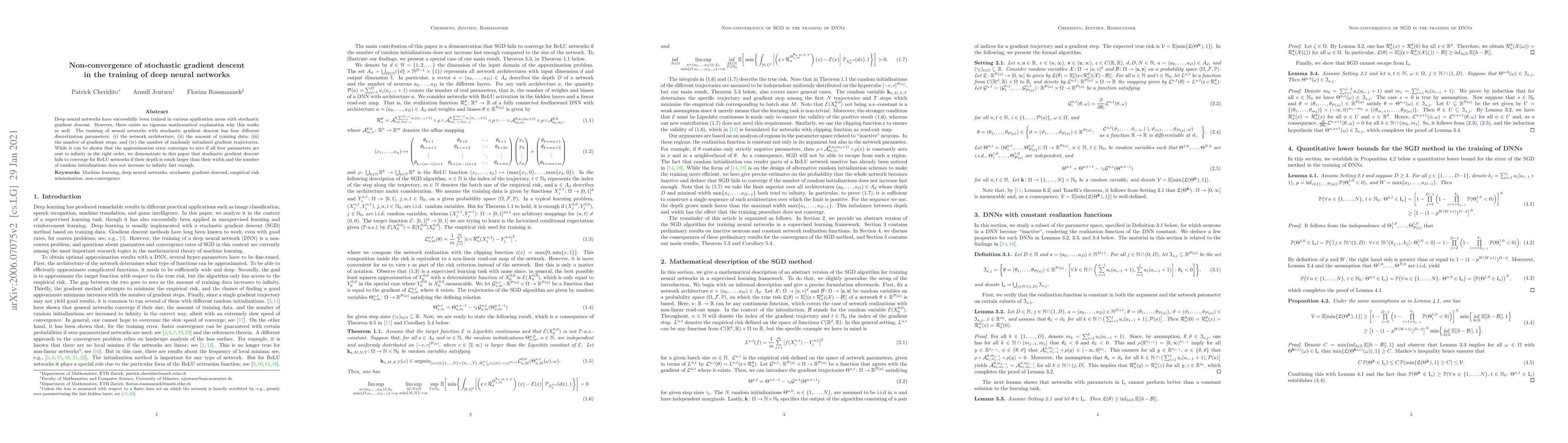 This paper investigates the non-convergence of stochastic gradient descent in training deep neural networks, particularly ReLU networks with large depth relative to width, when the number of random initializations does not scale sufficiently. Despite the convergence of approximation error under ideal conditions, practical limitations reveal failure in convergence for certain network architectures.