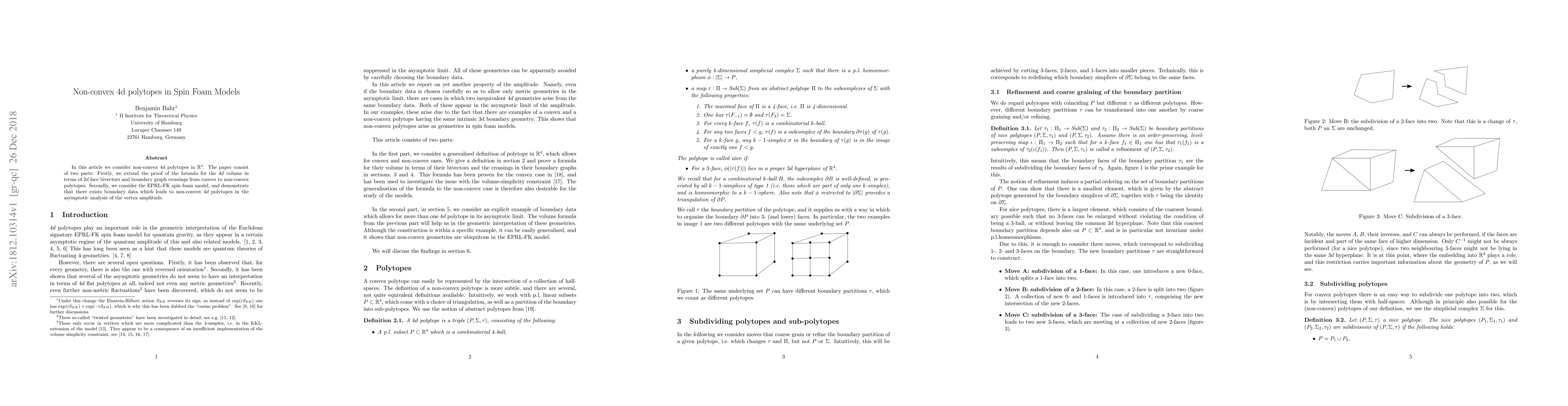 In this article we consider non-convex $4d$ polytopes in $\mathbb{R}^4$. The paper consist of two parts: Firstly, we extend the proof of the formula for the $4d$ volume in terms of $2d$ face bivectors and boundary graph crossings from convex to non-convex polytopes. Secondly, we consider the EPRL-FK spin foam model, and demonstrate that there exists boundary data which leads to non-convex $4d$ polytopes in the asymptotic analysis of the vertex amplitude.