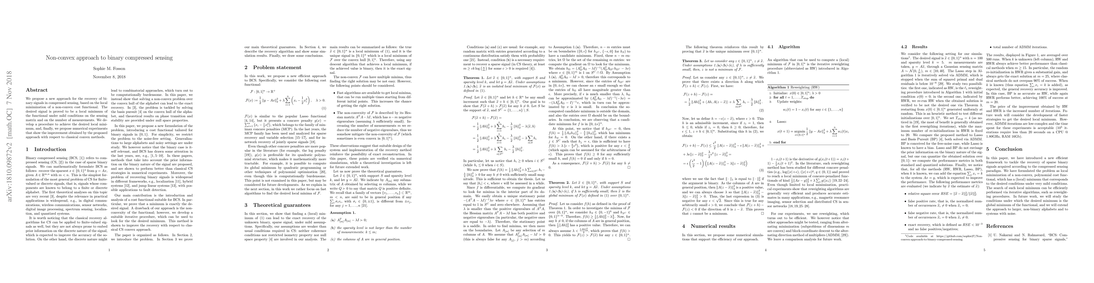 This paper proposes a non-convex method for recovering binary signals in compressed sensing, demonstrating that the desired signal is a local minimum of the non-convex cost functional under certain conditions. Numerical experiments show that this approach outperforms the classical convex Lasso method.