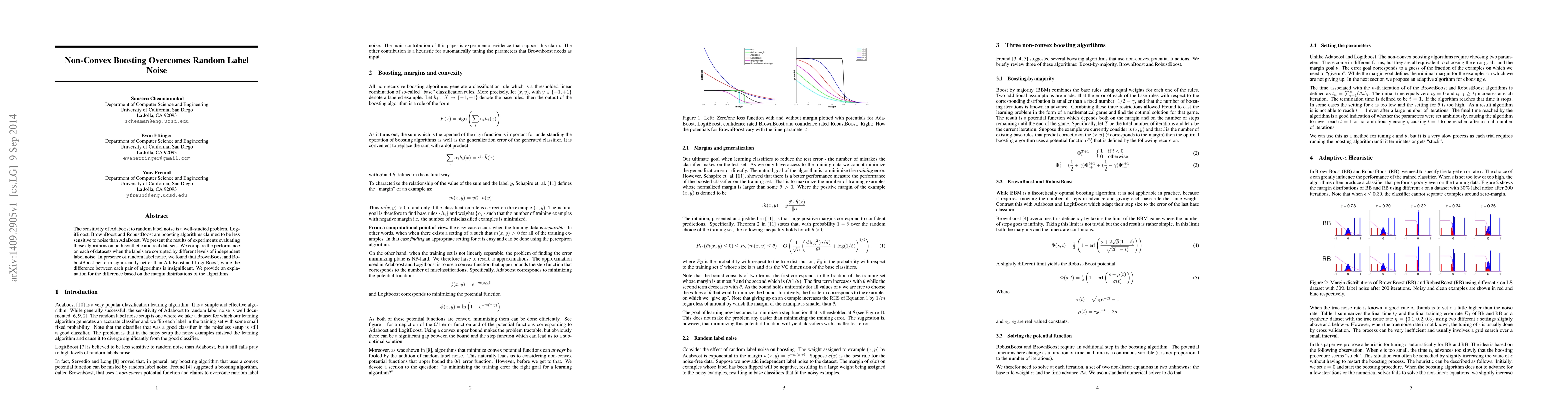 This paper evaluates the performance of BrownBoost and RobustBoost against AdaBoost and LogitBoost in the presence of random label noise. Experimental results show that BrownBoost and RobustBoost outperform AdaBoost and LogitBoost under noise conditions, with no significant difference between the former two.