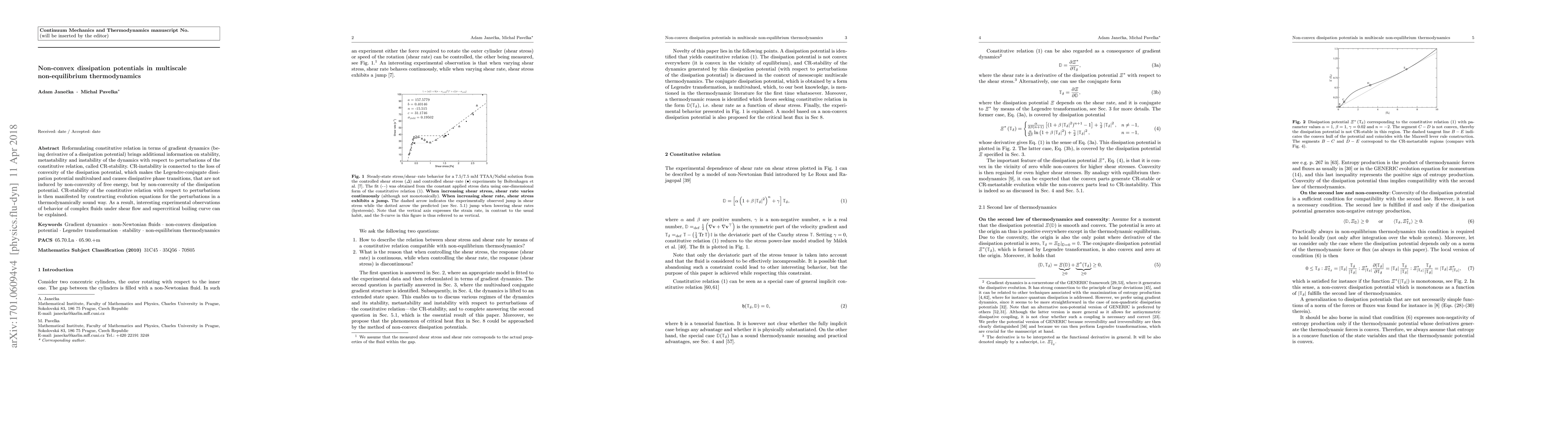 Reformulating constitutive relation in terms of gradient dynamics (being derivative of a dissipation potential) brings additional information on stability, metastability and instability of the dynamics with respect to perturbations of the constitutive relation, called CR-stability. CR-instability is connected to the loss of convexity of the dissipation potential, which makes the Legendre-conjugate dissipation potential multivalued and causes dissipative phase transitions, that are not induced by non-convexity of free energy, but by non-convexity of the dissipation potential. CR-stability of the constitutive relation with respect to perturbations is then manifested by constructing evolution equations for the perturbations in a thermodynamically sound way. As a result, interesting experimental observations of behavior of complex fluids under shear flow and supercritical boiling curve can be explained.