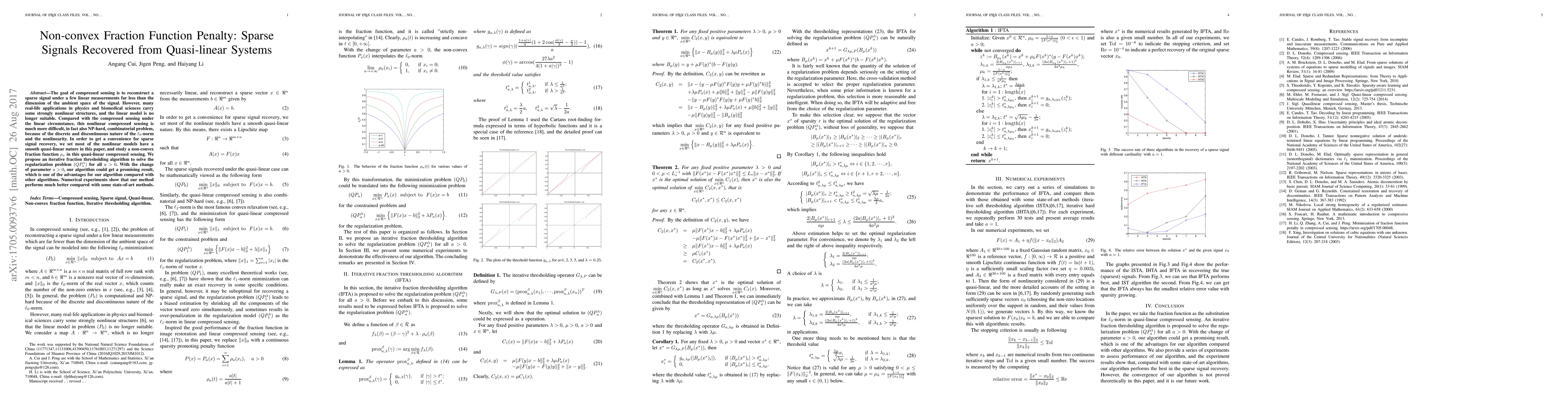 This paper proposes a non-convex fraction function penalty for recovering sparse signals from quasi-linear systems, addressing the challenges of nonlinear compressed sensing. An iterative fraction thresholding algorithm is introduced to solve the regularization problem, demonstrating superior performance over state-of-the-art methods in numerical experiments.