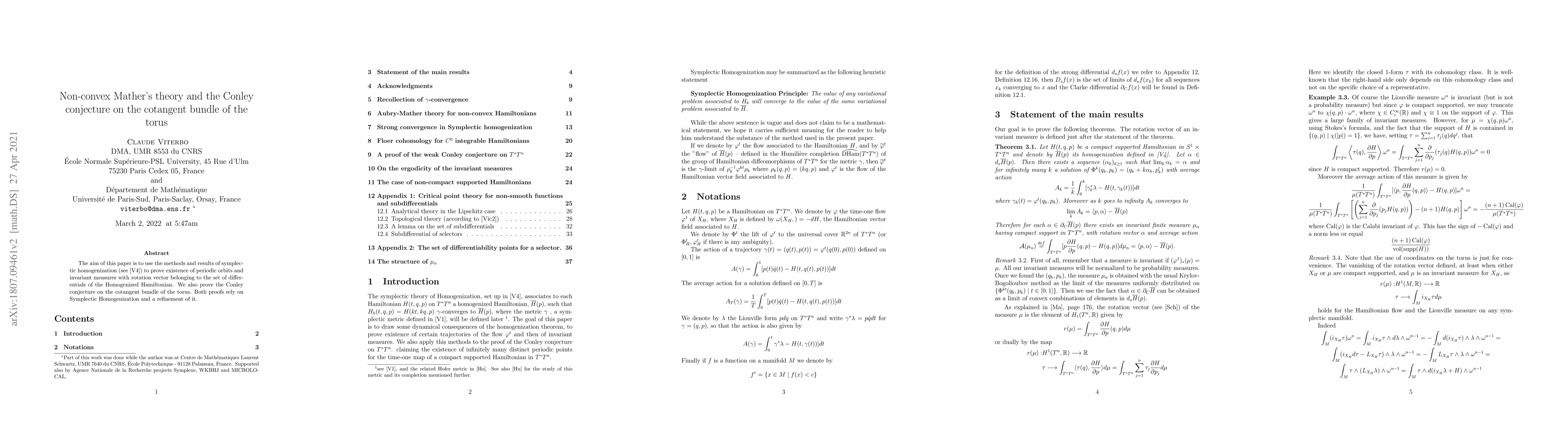 This paper proves the Conley conjecture on the cotangent bundle of the torus using Symplectic Homogenization, a method that creates periodic orbits and invariant measures with rotation numbers depending on the differential of the Homogenized Hamiltonian.