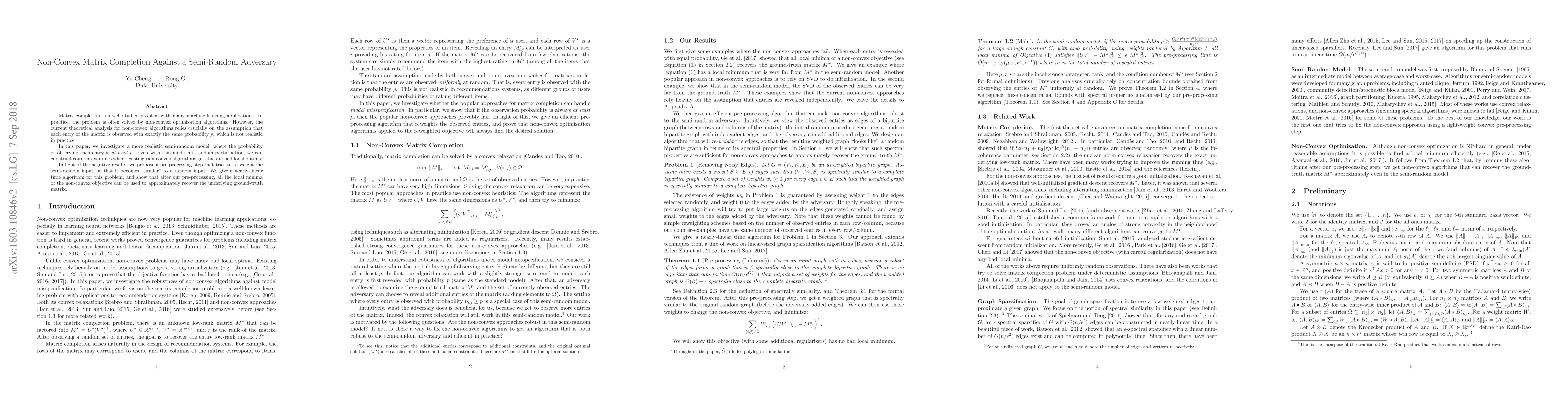 Researchers show that existing non-convex algorithms for matrix completion can get stuck in bad local optima when faced with a semi-random model where not every entry is observed with the same probability. A pre-processing step helps to recover the underlying ground-truth matrix.