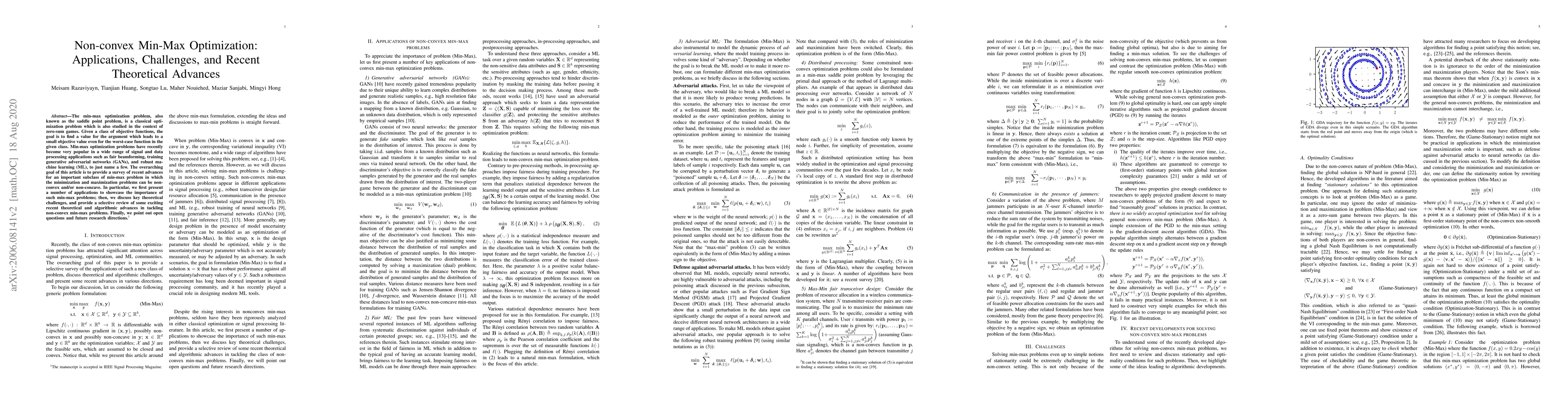 This paper surveys recent advances in non-convex min-max optimization problems, highlighting applications in signal processing and machine learning, and discusses theoretical challenges and new algorithmic approaches to tackle these complex optimization problems. It also identifies open questions and future research directions.