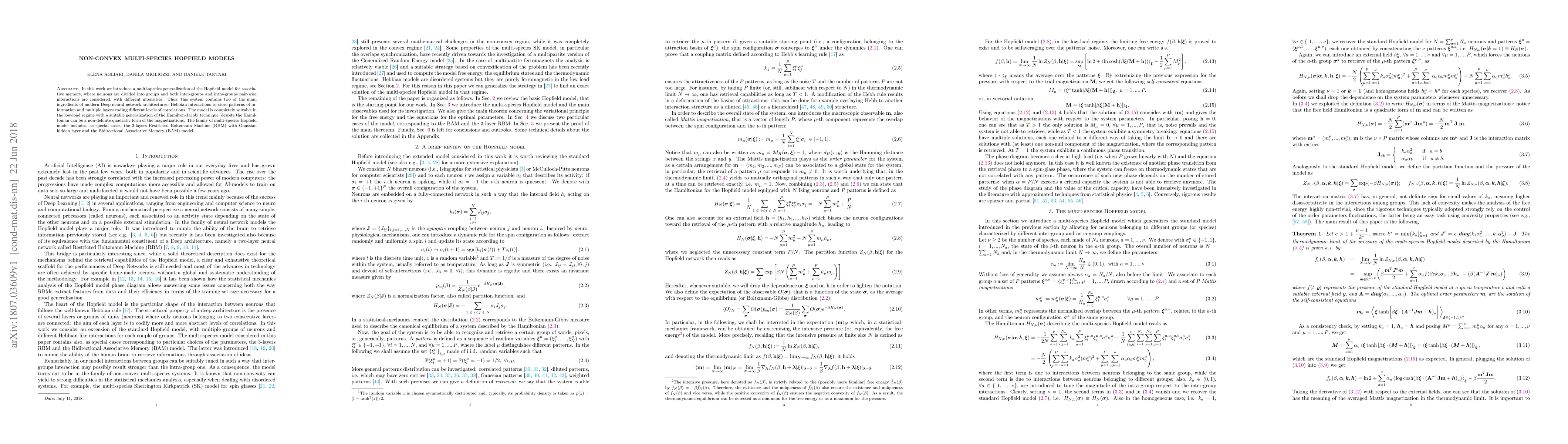 In this work we introduce a multi-species generalization of the Hopfield model for associative memory, where neurons are divided into groups and both inter-groups and intra-groups pair-wise interactions are considered, with different intensities. Thus, this system contains two of the main ingredients of modern Deep neural network architectures: Hebbian interactions to store patterns of information and multiple layers coding different levels of correlations. The model is completely solvable in the low-load regime with a suitable generalization of the Hamilton-Jacobi technique, despite the Hamiltonian can be a non-definite quadratic form of the magnetizations. The family of multi-species Hopfield model includes, as special cases, the 3-layers Restricted Boltzmann Machine (RBM) with Gaussian hidden layer and the Bidirectional Associative Memory (BAM) model.