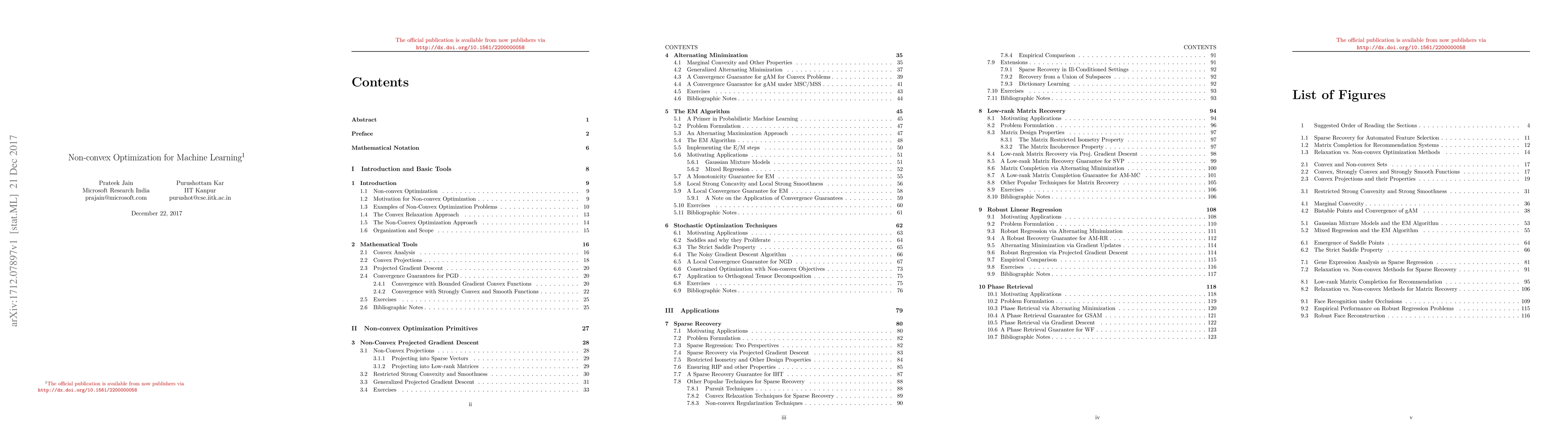A vast majority of machine learning algorithms train their models and perform inference by solving optimization problems. In order to capture the learning and prediction problems accurately, structural constraints such as sparsity or low rank are frequently imposed or else the objective itself is designed to be a non-convex function. This is especially true of algorithms that operate in high-dimensional spaces or that train non-linear models such as tensor models and deep networks. The freedom to express the learning problem as a non-convex optimization problem gives immense modeling power to the algorithm designer, but often such problems are NP-hard to solve. A popular workaround to this has been to relax non-convex problems to convex ones and use traditional methods to solve the (convex) relaxed optimization problems. However this approach may be lossy and nevertheless presents significant challenges for large scale optimization. On the other hand, direct approaches to non-convex optimization have met with resounding success in several domains and remain the methods of choice for the practitioner, as they frequently outperform relaxation-based techniques - popular heuristics include projected gradient descent and alternating minimization. However, these are often poorly understood in terms of their convergence and other properties. This monograph presents a selection of recent advances that bridge a long-standing gap in our understanding of these heuristics. The monograph will lead the reader through several widely used non-convex optimization techniques, as well as applications thereof. The goal of this monograph is to both, introduce the rich literature in this area, as well as equip the reader with the tools and techniques needed to analyze these simple procedures for non-convex problems.