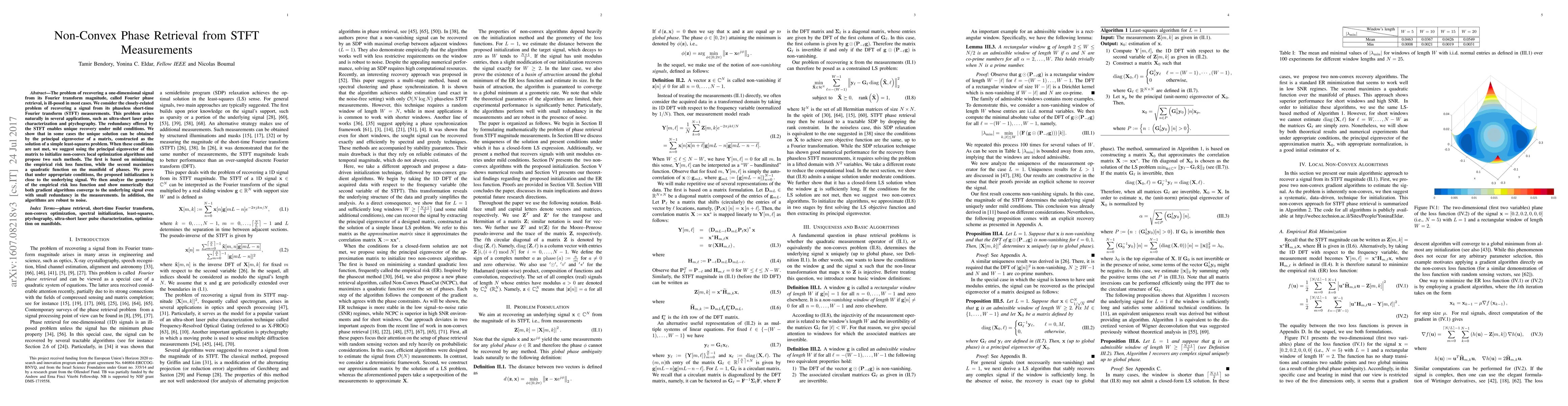 This paper addresses the challenge of reconstructing a signal from its phaseless short-time Fourier transform (STFT) measurements, proposing methods to achieve unique recovery under mild conditions. It introduces non-convex optimization algorithms initialized by the principal eigenvector of a least-squares matrix solution, demonstrating convergence and robustness to noise.