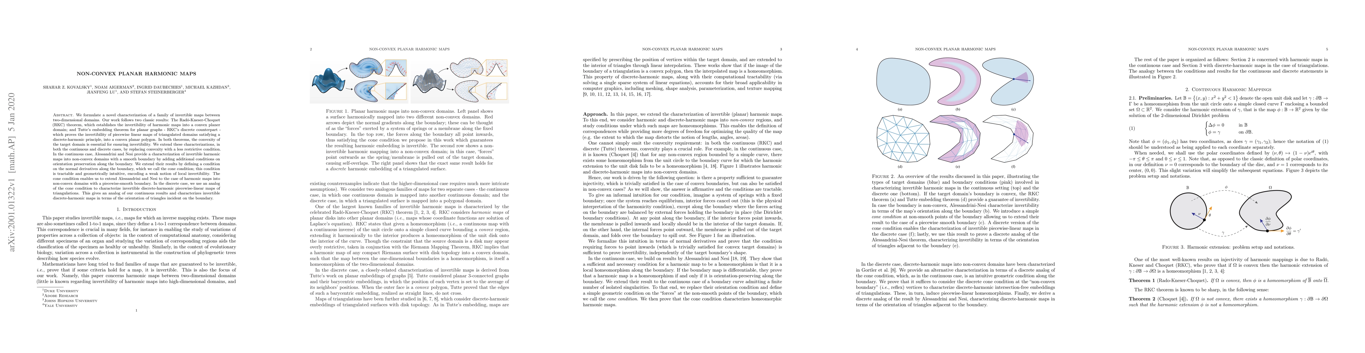 We formulate a novel characterization of a family of invertible maps between two-dimensional domains. Our work follows two classic results: The Rad\'o-Kneser-Choquet (RKC) theorem, which establishes the invertibility of harmonic maps into a convex planer domain; and Tutte's embedding theorem for planar graphs - RKC's discrete counterpart - which proves the invertibility of piecewise linear maps of triangulated domains satisfying a discrete-harmonic principle, into a convex planar polygon. In both theorems, the convexity of the target domain is essential for ensuring invertibility. We extend these characterizations, in both the continuous and discrete cases, by replacing convexity with a less restrictive condition. In the continuous case, Alessandrini and Nesi provide a characterization of invertible harmonic maps into non-convex domains with a smooth boundary by adding additional conditions on orientation preservation along the boundary. We extend their results by defining a condition on the normal derivatives along the boundary, which we call the cone condition; this condition is tractable and geometrically intuitive, encoding a weak notion of local invertibility. The cone condition enables us to extend Alessandrini and Nesi to the case of harmonic maps into non-convex domains with a piecewise-smooth boundary. In the discrete case, we use an analog of the cone condition to characterize invertible discrete-harmonic piecewise-linear maps of triangulations. This gives an analog of our continuous results and characterizes invertible discrete-harmonic maps in terms of the orientation of triangles incident on the boundary.