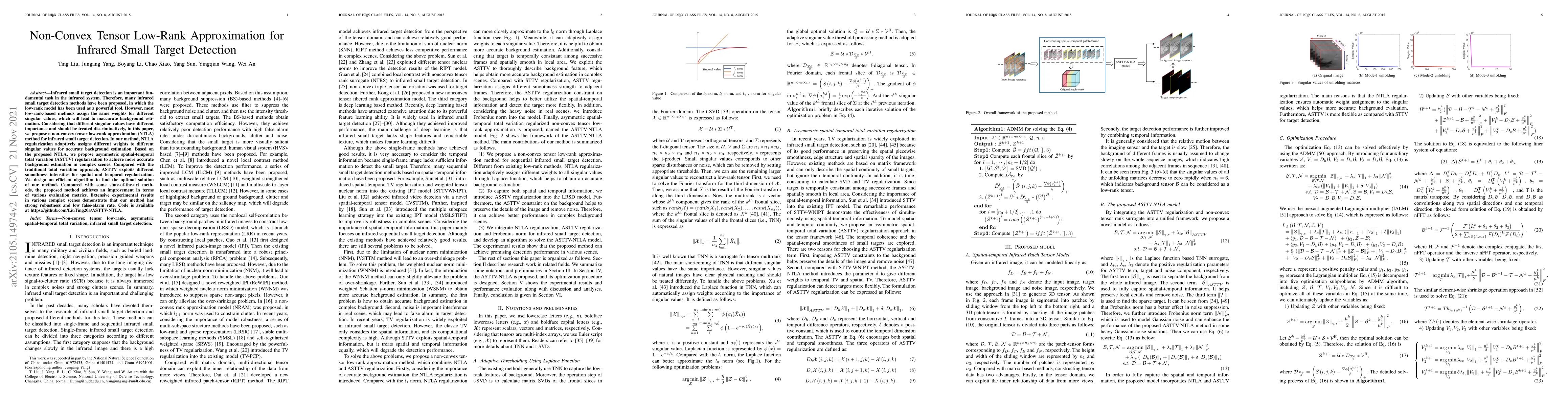 This paper proposes a non-convex tensor low-rank approximation (NTLA) method for infrared small target detection, which adaptively assigns different weights to singular values for more accurate background estimation. It introduces asymmetric spatial-temporal total variation (ASTTV) regularization for complex scenes and demonstrates improved performance over state-of-the-art methods.