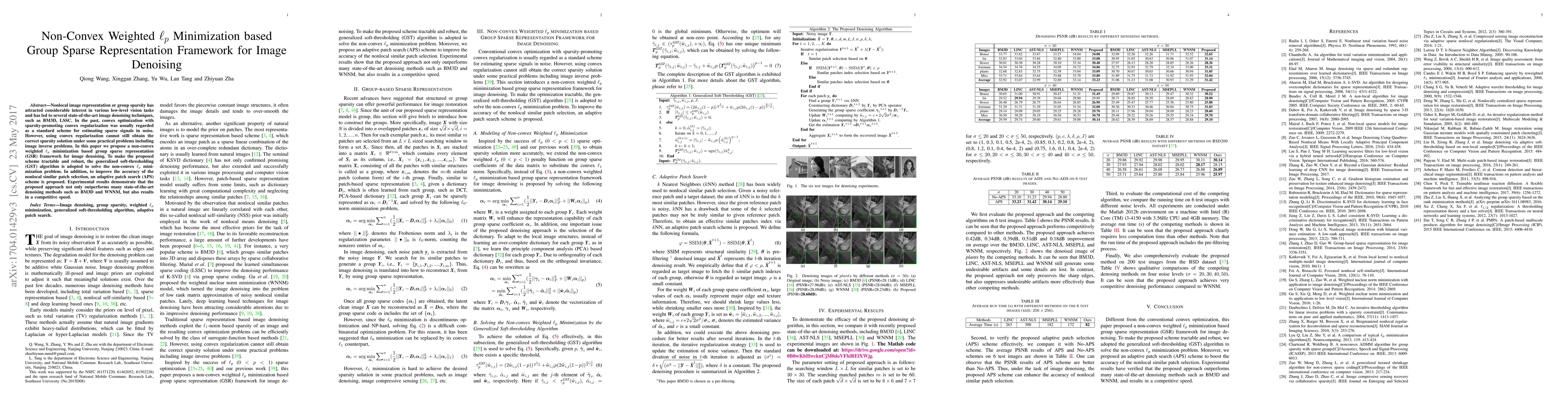 This paper proposes a non-convex weighted $\ell_p$ minimization based group sparse representation framework for image denoising, utilizing the generalized soft-thresholding algorithm and an adaptive patch search scheme for improved accuracy and efficiency, outperforming state-of-the-art methods like BM3D.