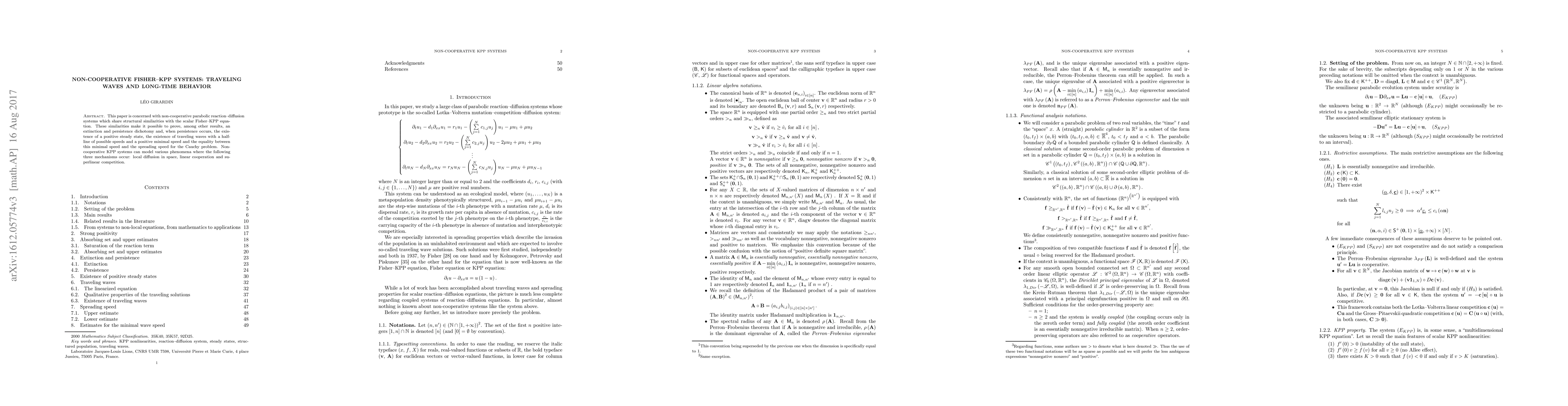 This paper investigates non-cooperative parabolic reaction-diffusion systems akin to the Fisher-KPP equation, proving an extinction-persistence dichotomy and the existence of traveling waves with a minimal speed equal to the spreading speed. It models phenomena involving local diffusion, linear cooperation, and superlinear competition.